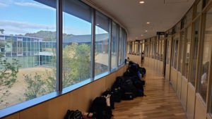 8時30分,SHRが始まります。廊下には整然と各自の荷物が置かれています。円形の廊下になってもここは変わっていません。