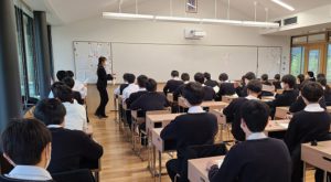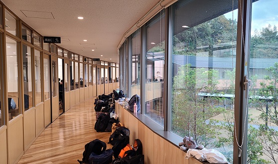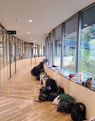 1時間目が始まりました。荷物が整然と並べられた廊下に緊張感が伝わってきます。