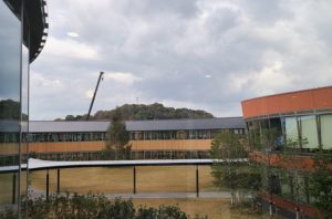 左:教員棟から本部棟(エントランス)への連絡通路から西側を見ると,中学棟があります。クレーンがあるところには,体育館が出来上がる予定です。