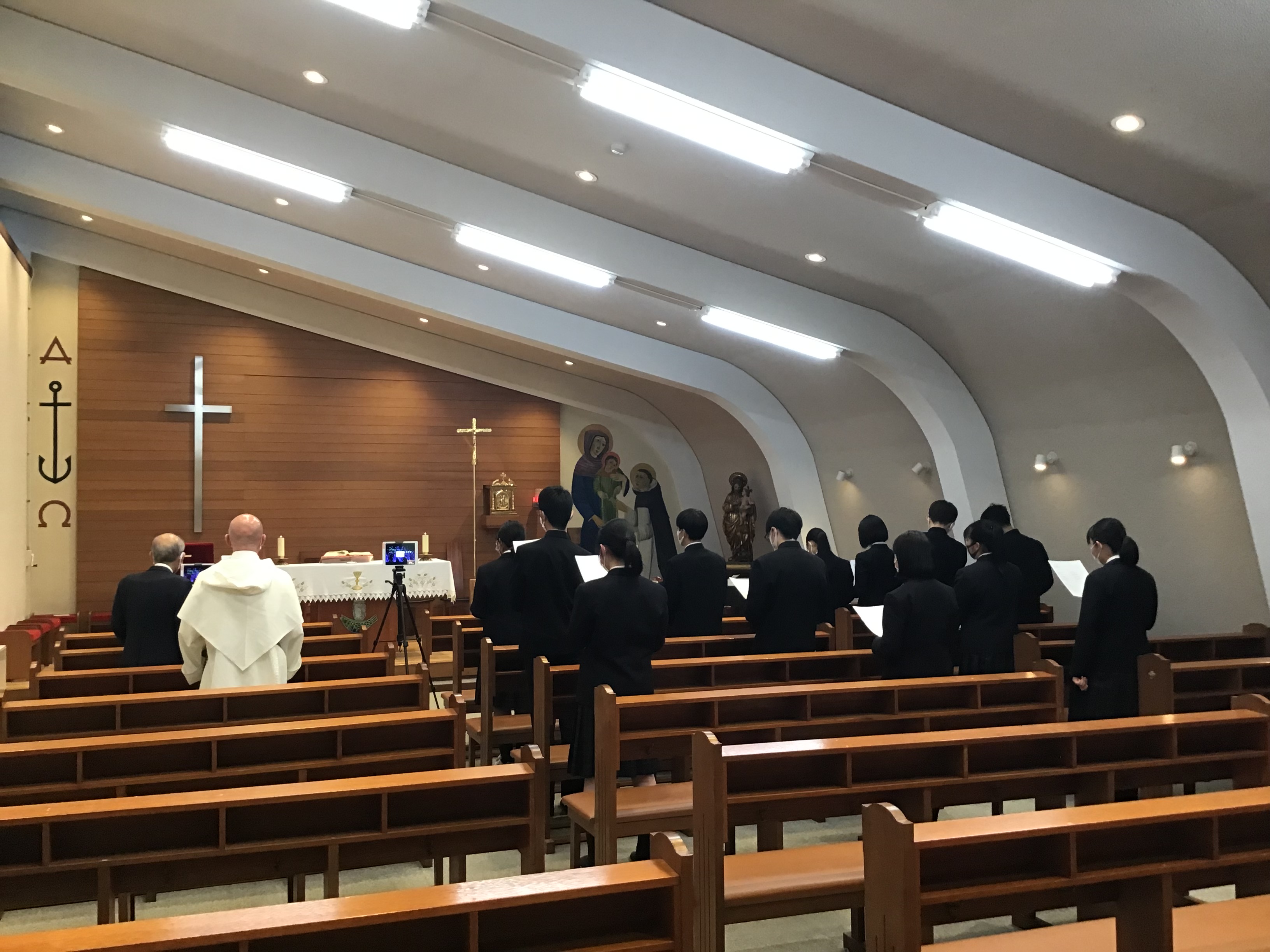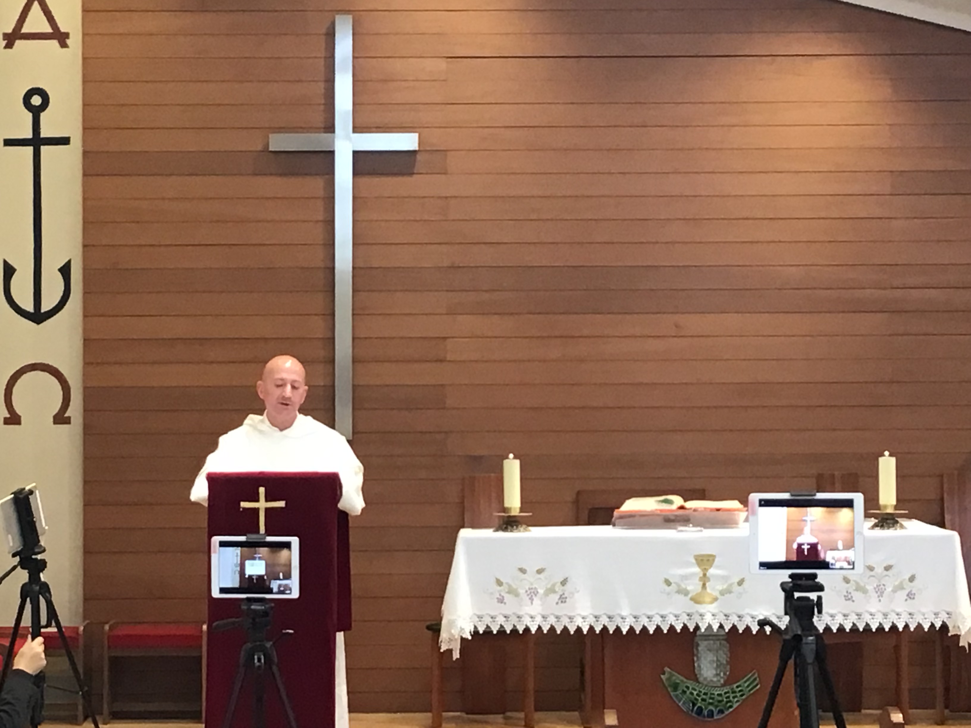 係の人たちは、聖堂に集まり、聖堂からリアルタイムで中継です。