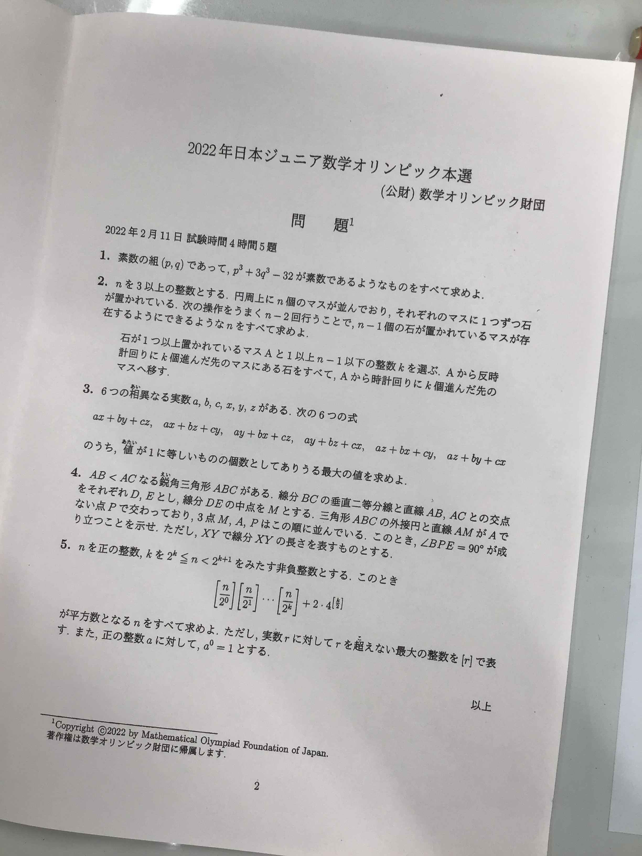 問題は5問、試験時間は4時間です。本選参加者のうち上位10名はメダルの授与があり、そのうち上位5名は3月に代表選考合宿に参加JMO (日本数学オリンピック)の 上位者と共にテスト等を受け、その結果により日本代表選手6名が選ばれるということです。
