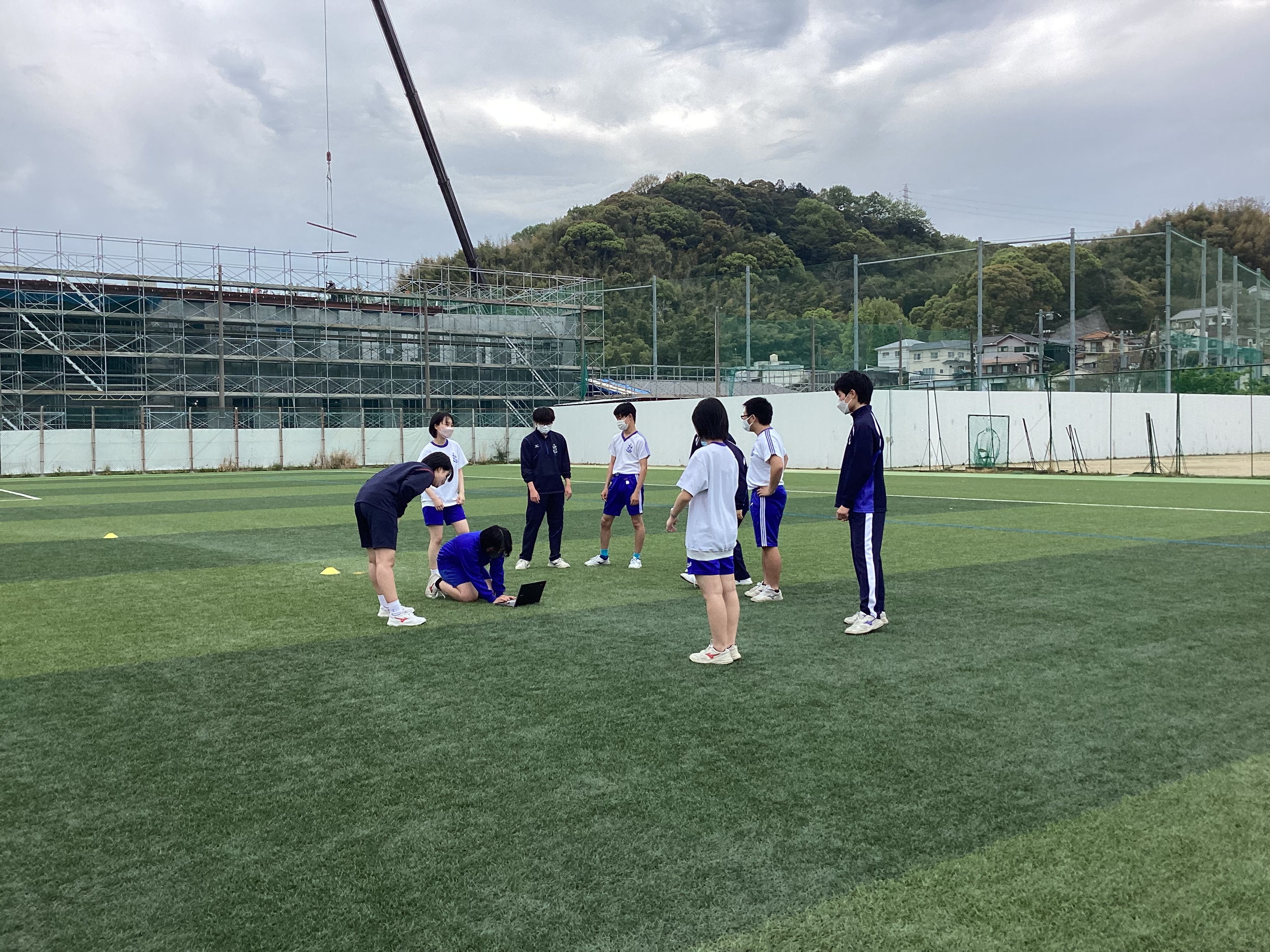 人工芝では、グループに分かれて、パソコンを見ながら研究しています。