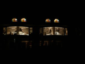 夜の図書館、ステンドグラスの照明が鮮やかです。