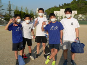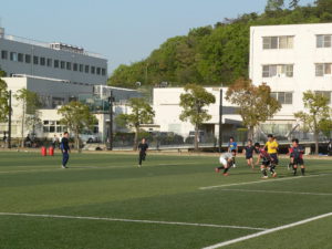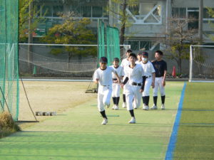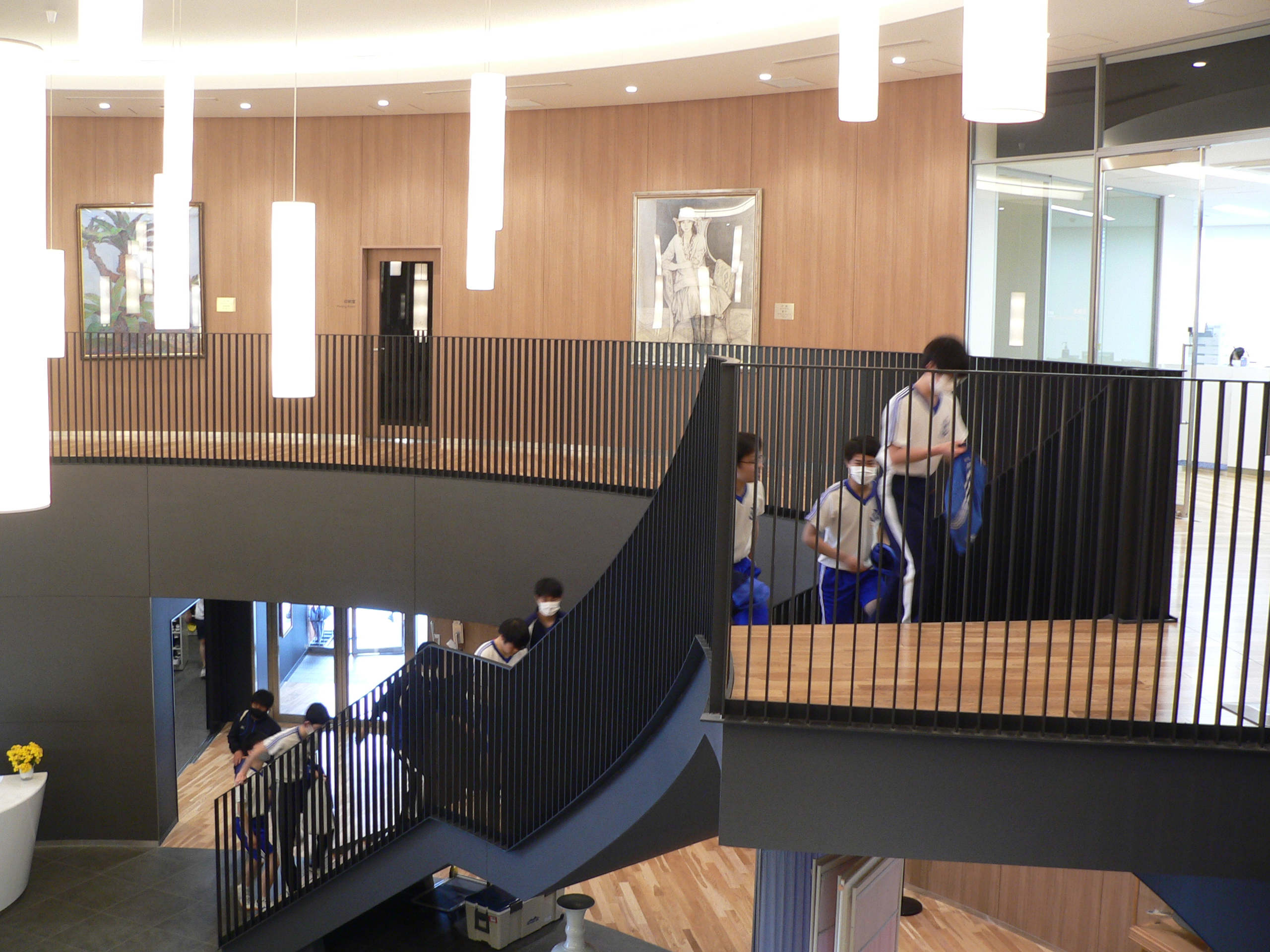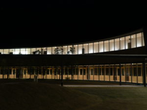 円形の廊下の照明で夕やみに浮かぶ校舎