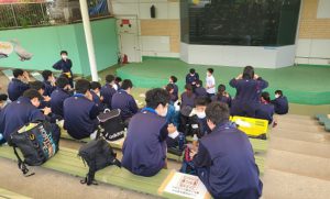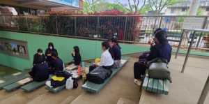 屋根のあるステージをお借りして,戻ってきた生徒たちから順に昼食休憩をとりました。