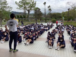 クラスごとに整列して、注意事項を確認中