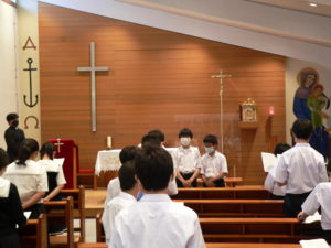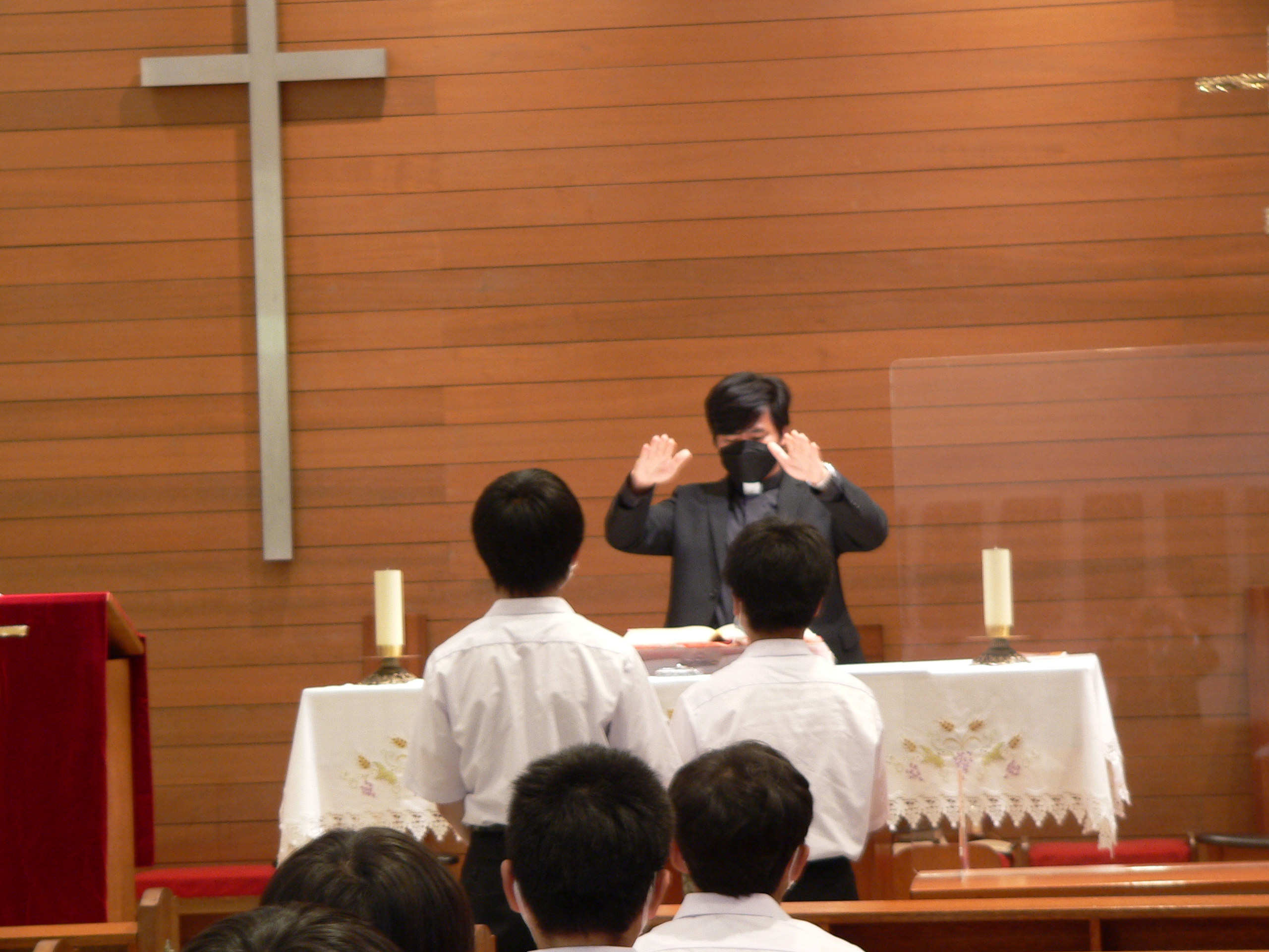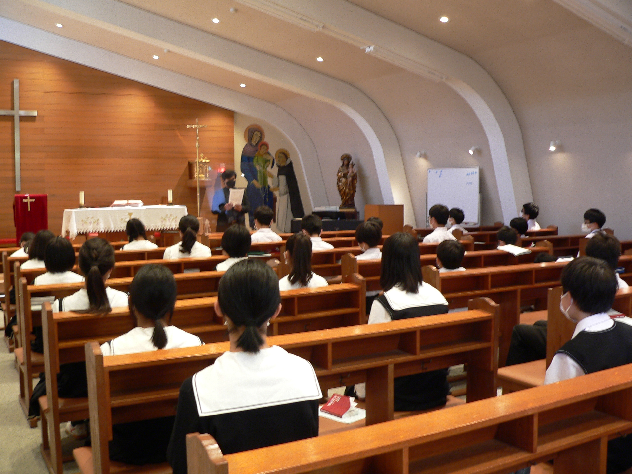 神父様の聖書の解説に耳を傾ける生徒たちです。