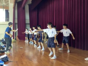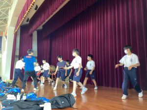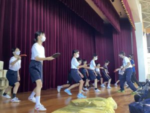 6月上旬から入部した中1生はまずステージ上で素振りを教わっています。