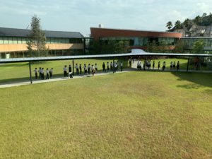 中1から高Ⅱまでの全生徒で片づけています。その中でもオレンジ色のTシャツを着た文化祭実行委員会が中心となって作業をしています。