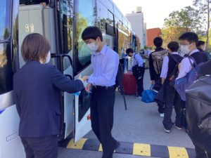 荷物を預けて、指手消毒をしてバスに乗り込みます。