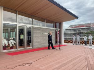 本日カフェテリアがオープンしました。(写真は朝のオープニングイベントでの校長挨拶)