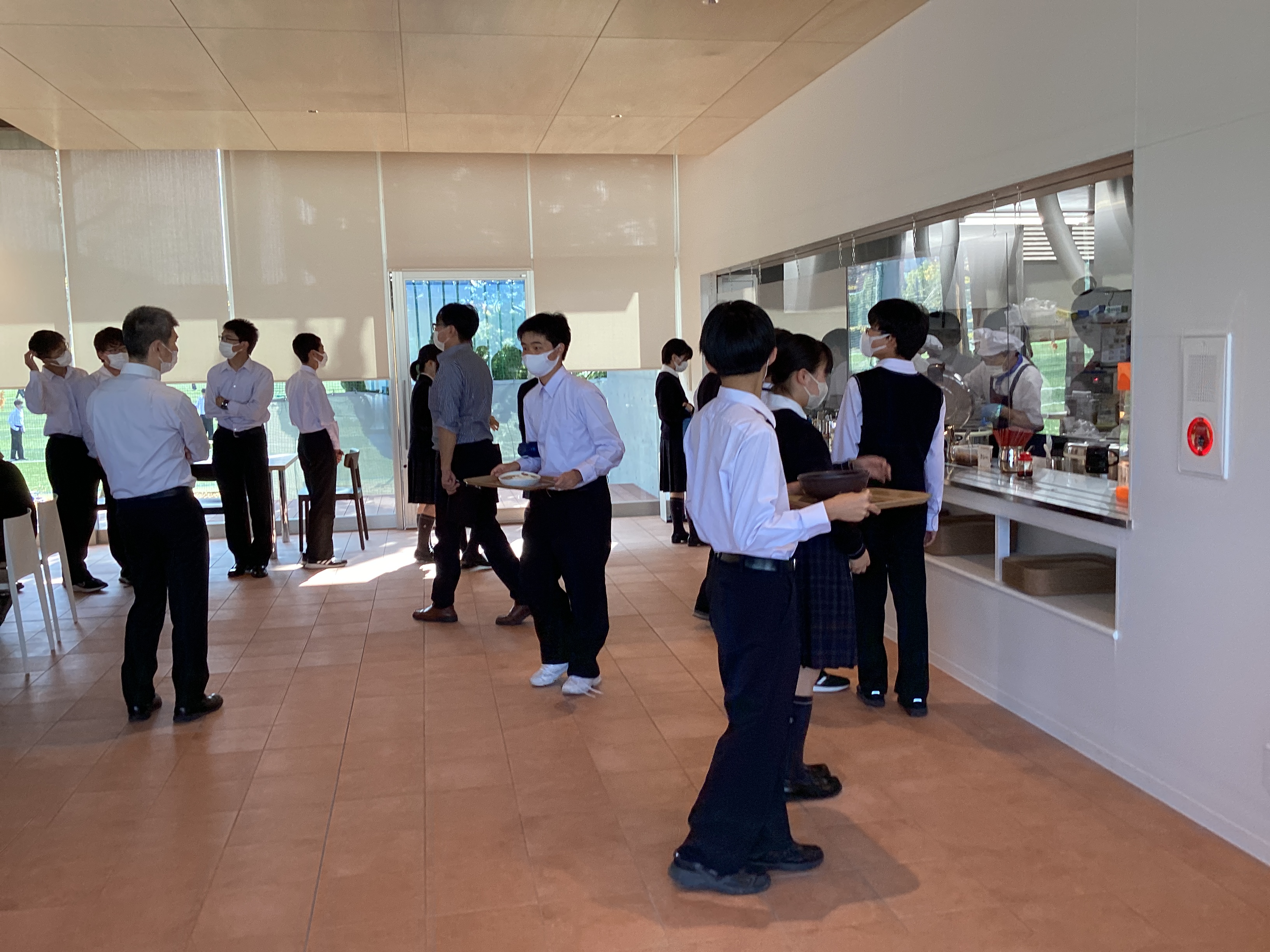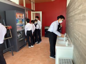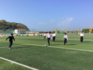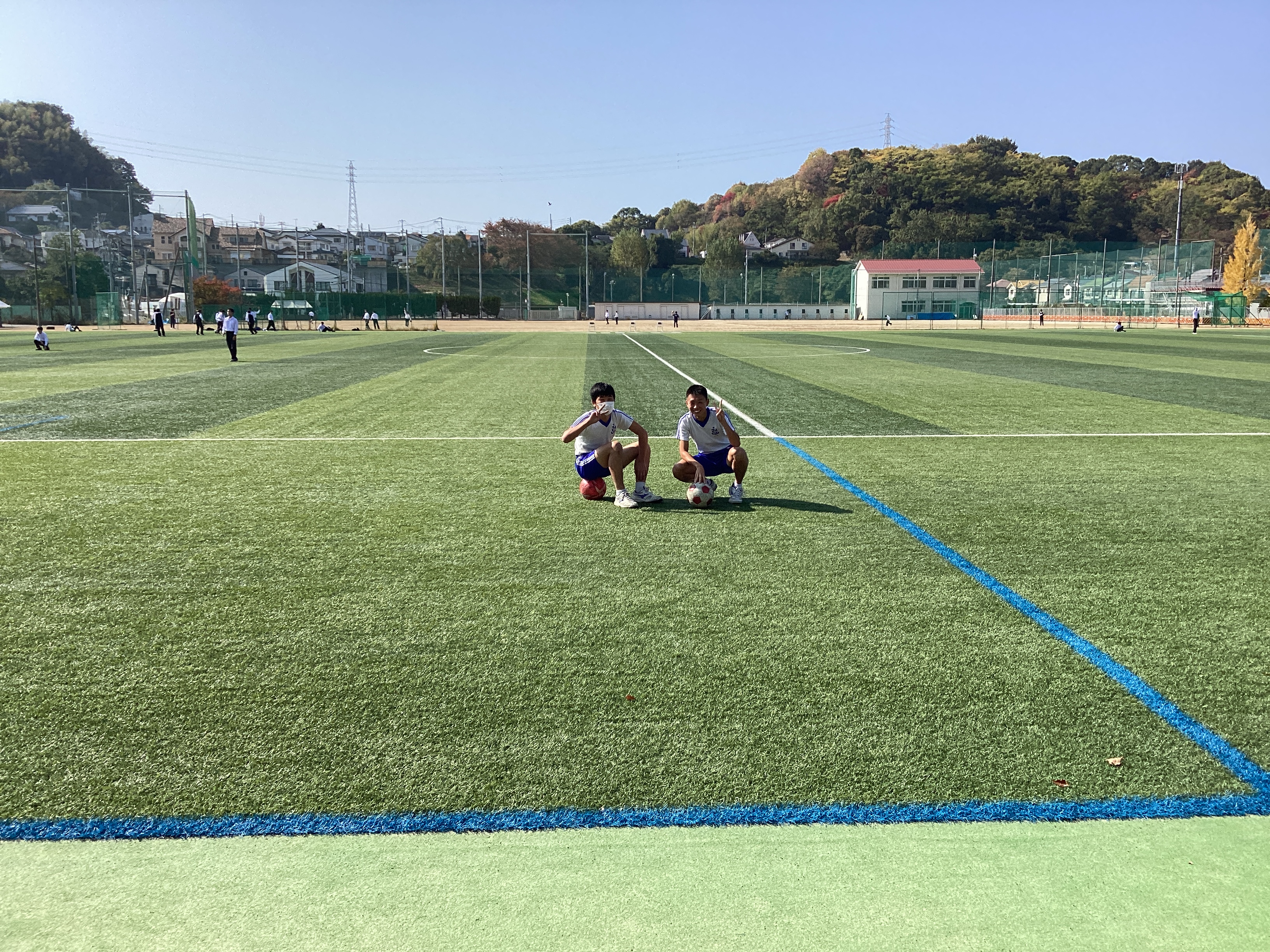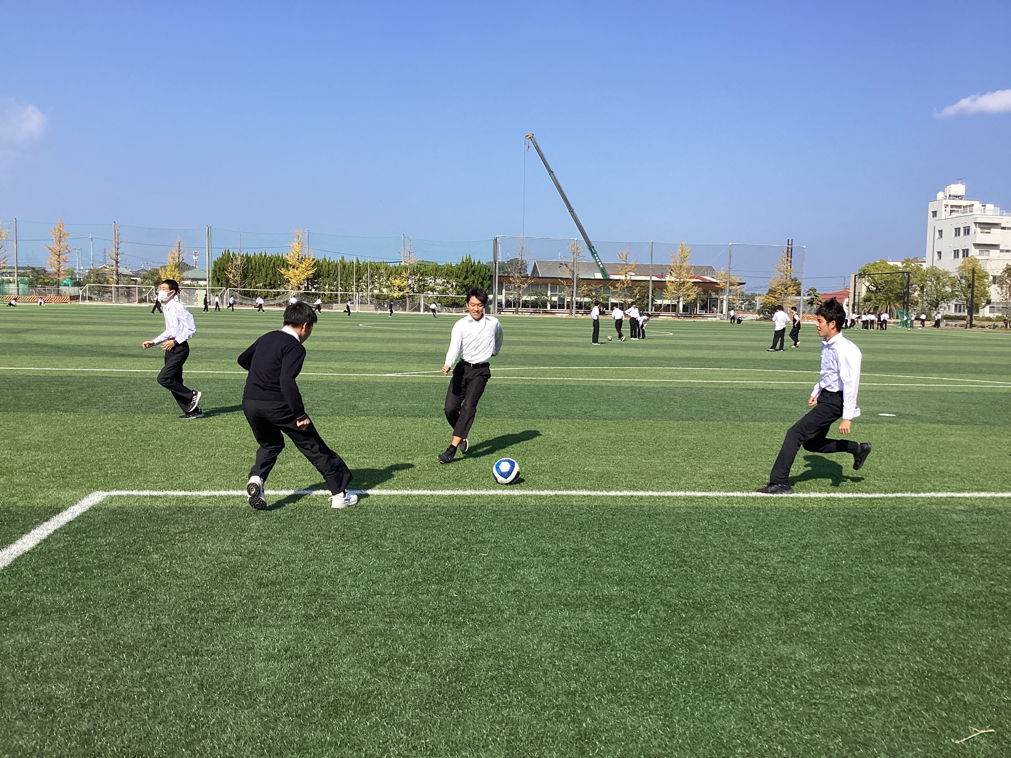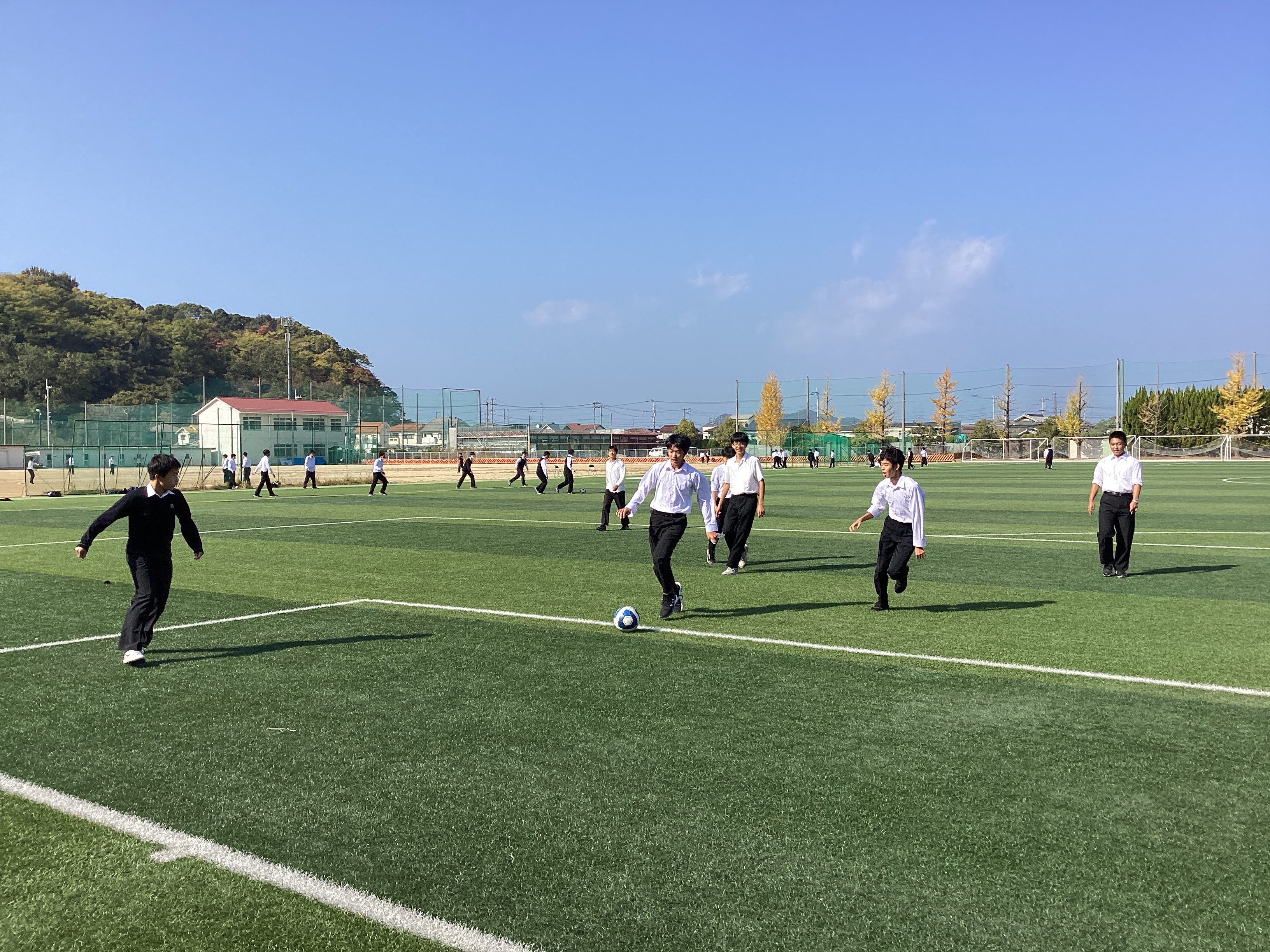 人工芝では、サッカーをしている生徒がいます。