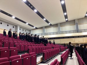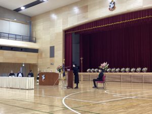 体育館には各クラスの議長・副議長が参加し、他の生徒はZoomでの参加となりました。