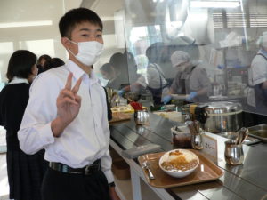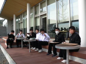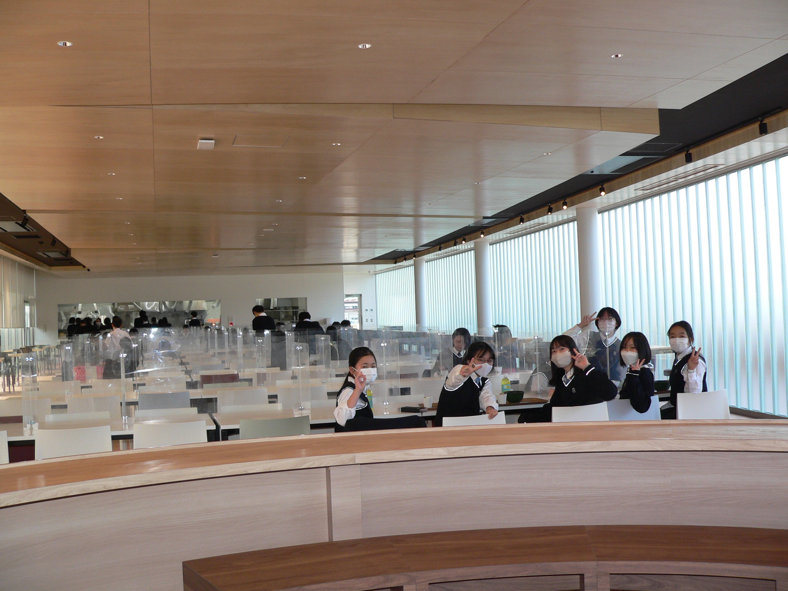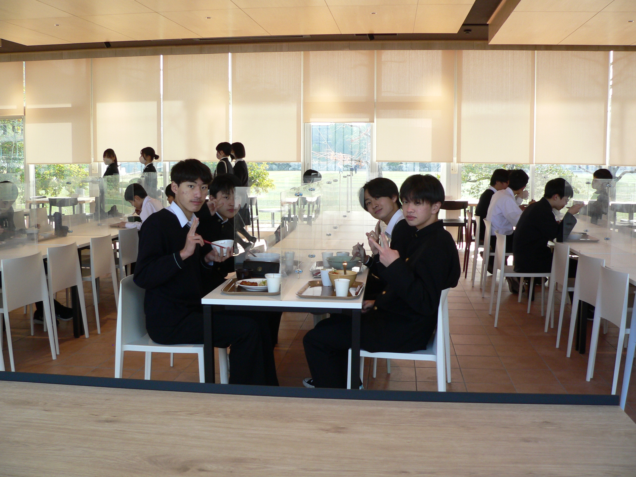 中央のテーブルで食事をする生徒たちを