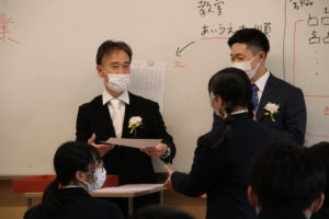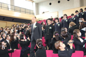 卒業生父母代表挨拶の後に校歌を聞き、それが終わると卒業生は退場して、各クラスで最後のホームルームです。