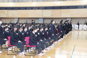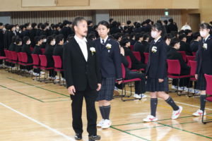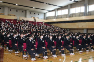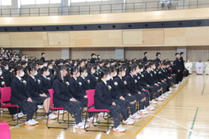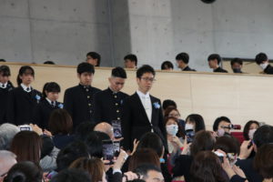 今日は、高Ⅲ65期生の卒業式です。心配された雨も降ることは無く、新体育館での気持ちの良い卒業式になりまた。2階から親御さんの間の通路を通って、各クラスが入場してきます。