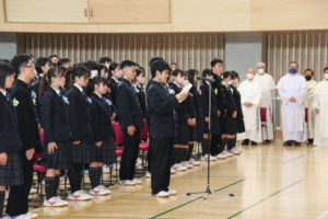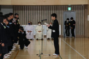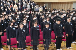 校長先生や理事長先生、父母の会や同窓会の方の祝辞の後に、在校生総代の送辞(左)と卒業生総代(右)の答辞で、卒業式はクライマックスを迎えます。先輩と後輩の強い絆と思い出が感じられる時間です。