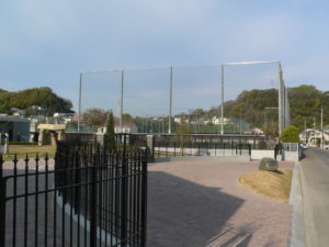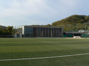 グラウンドの人口芝の南側に体育館が