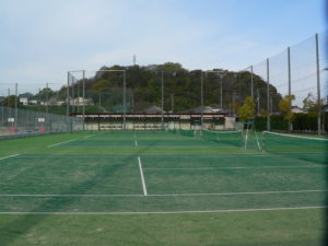 5面のテニスコートが朝日を受けて輝いて
