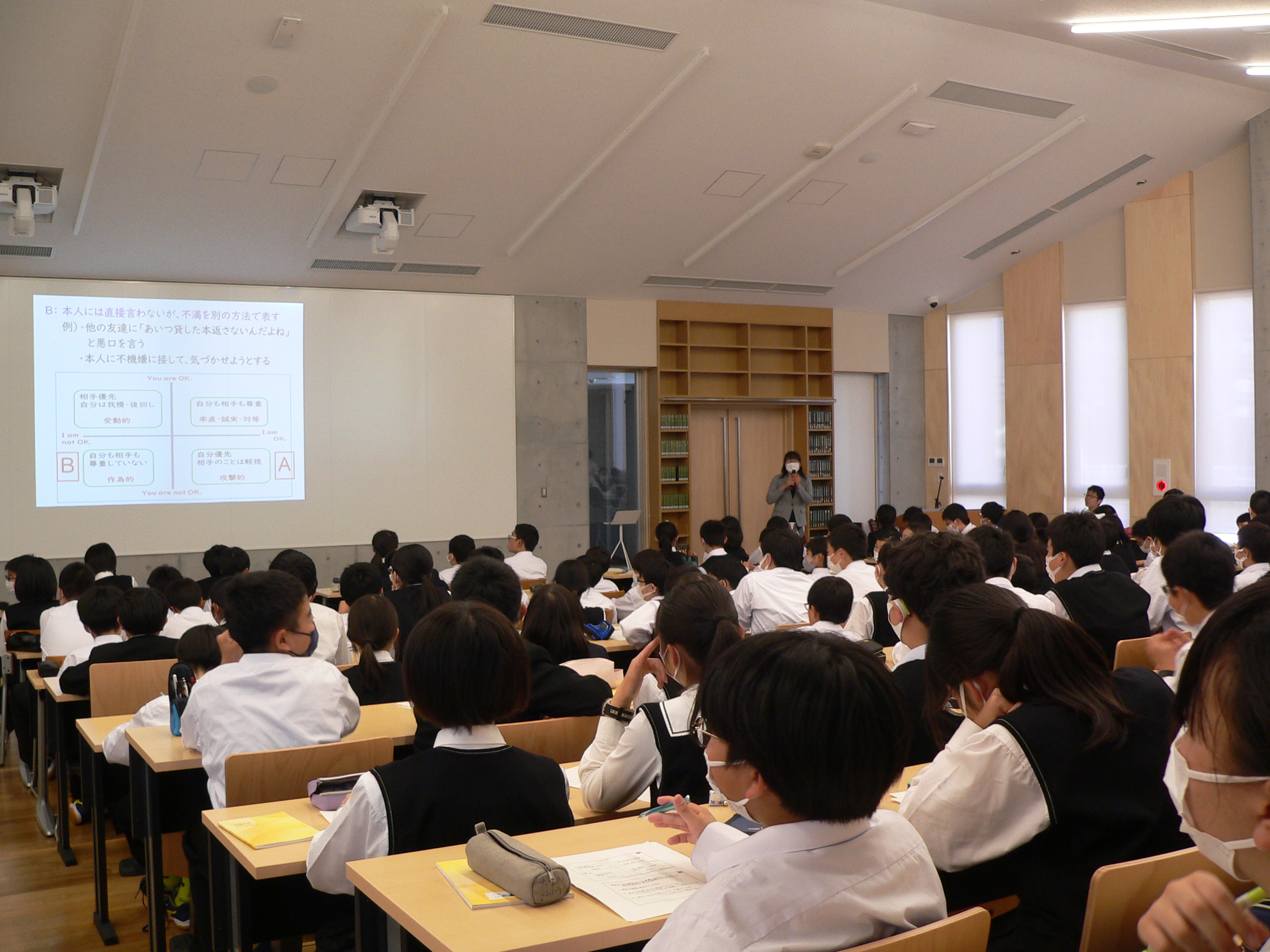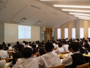 文化会館で講演に耳を傾ける中1生です。