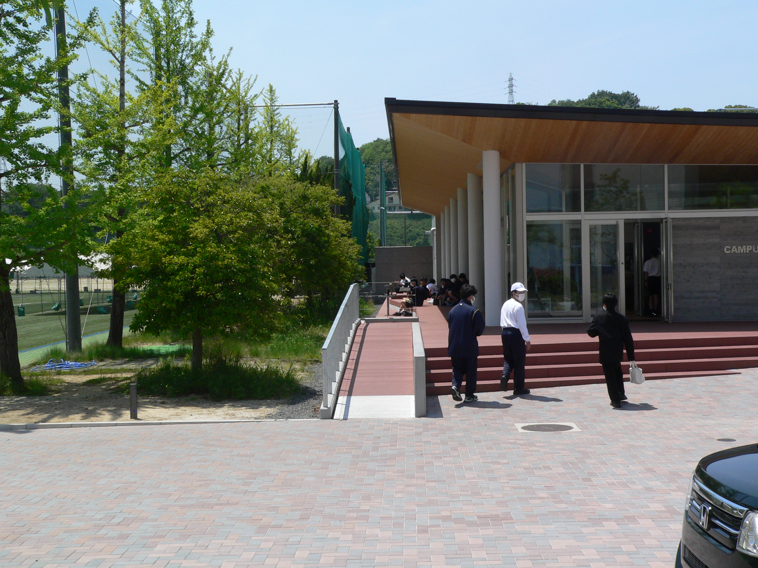 カフェテリアに向かう生徒と、テラスで