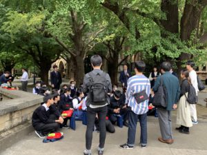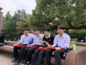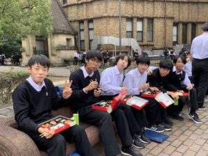 添乗員さんのお話に聞き入っているうちに、あっという間に東大に到着しました。 安田講堂前で記念写真を撮った後は、それぞれ校内でお弁当を食べたり、愛光卒業生にキャンパスを案内してもらったりと自由に過ごしました。