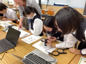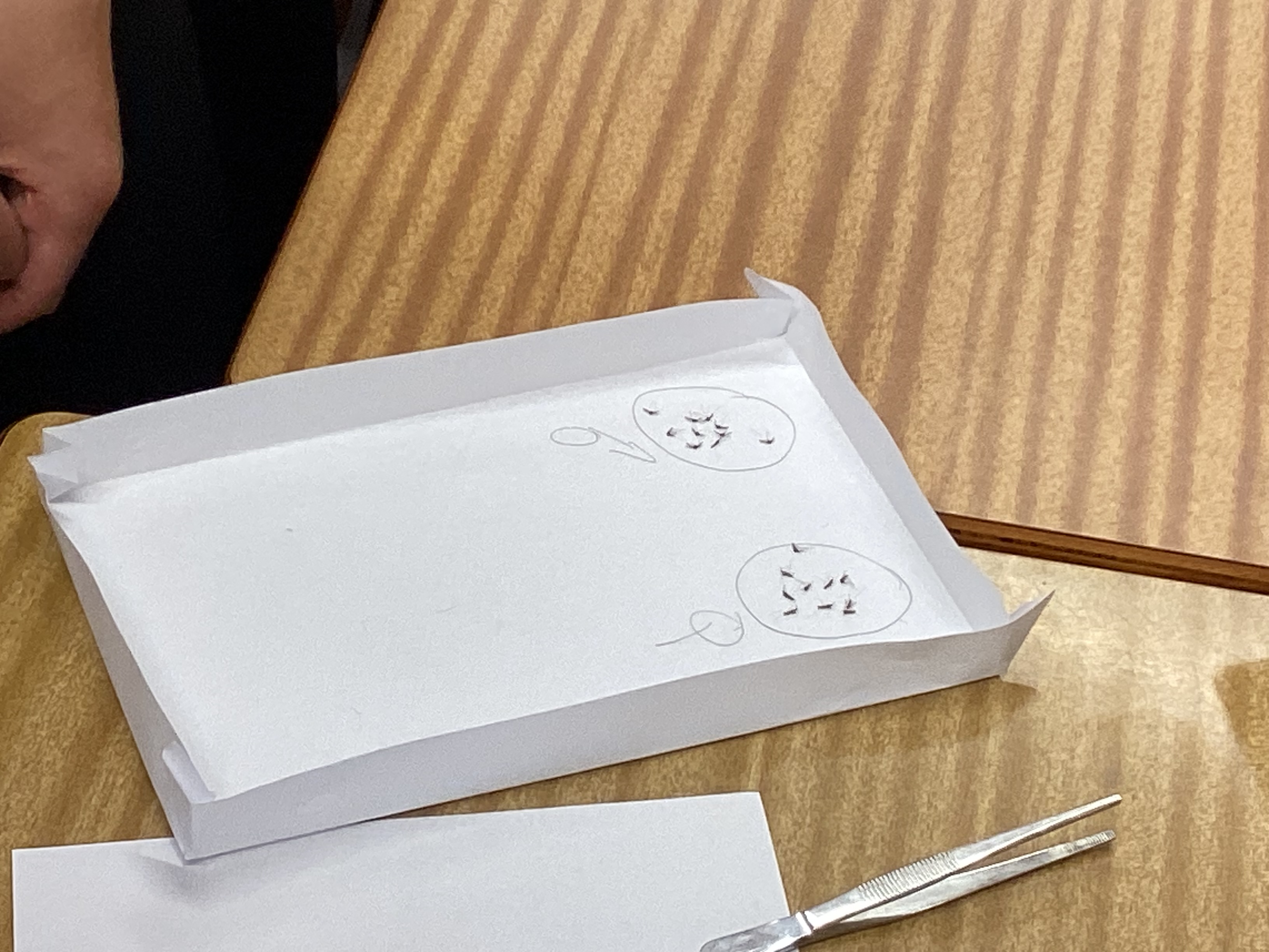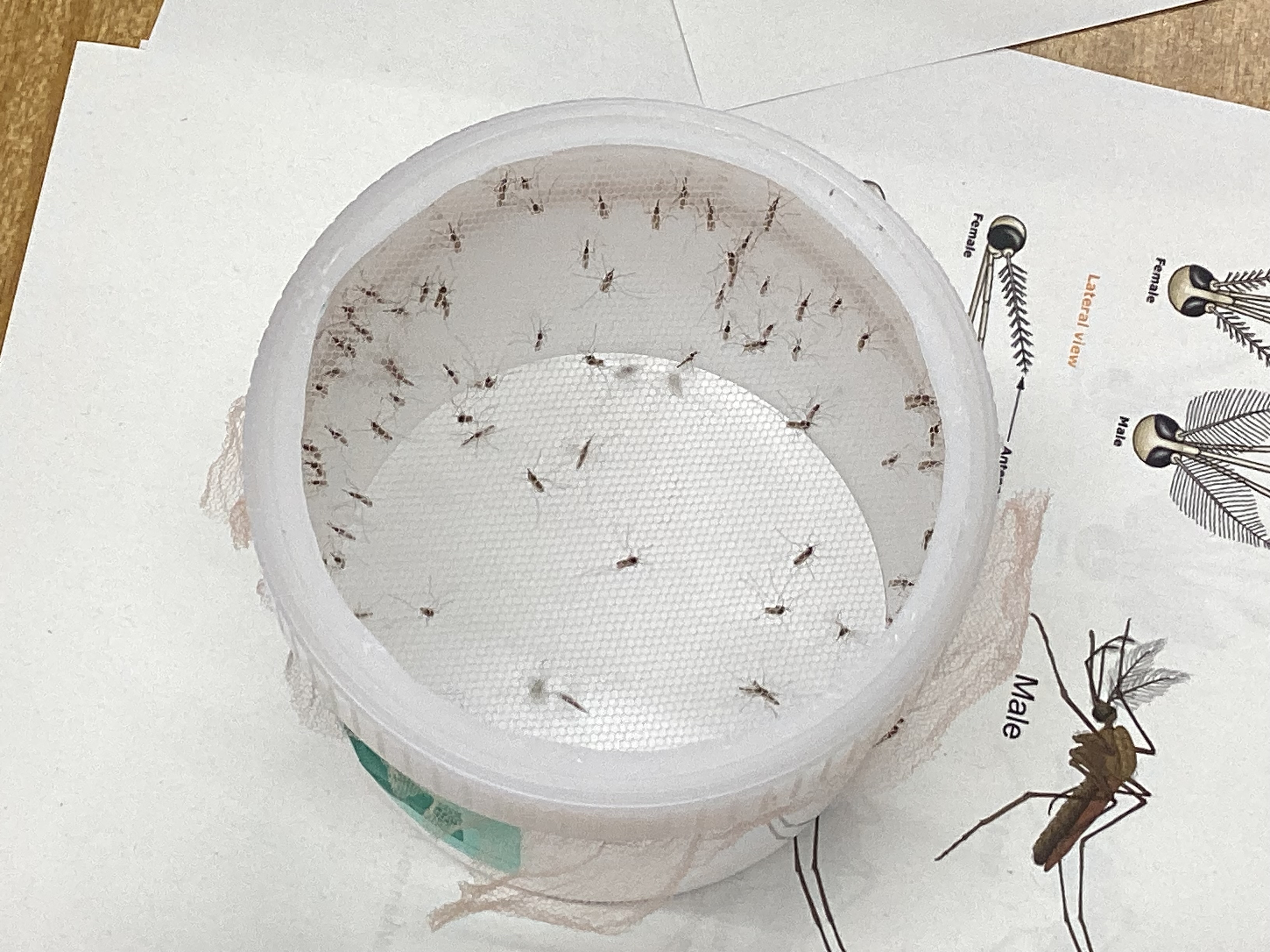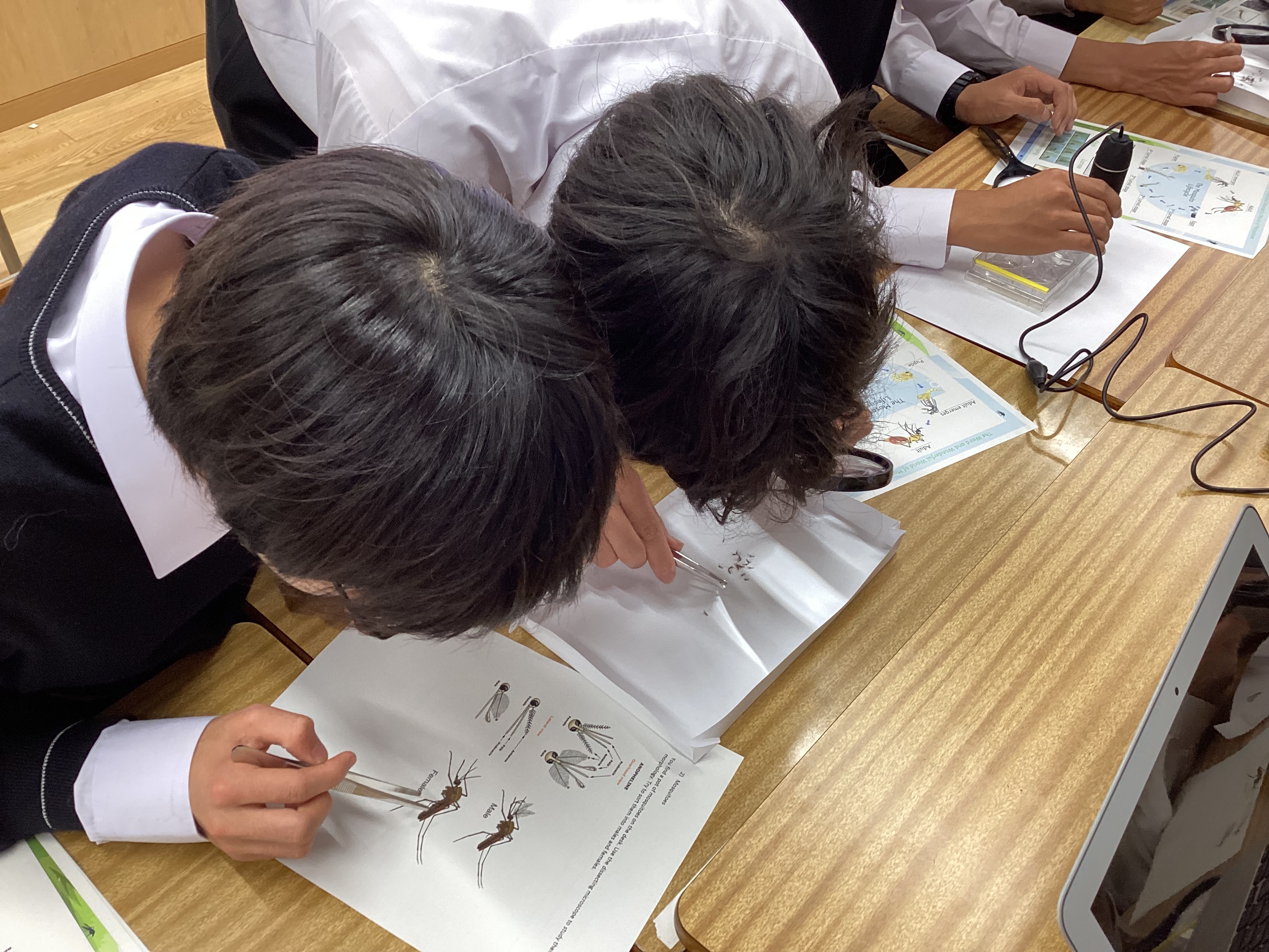 顕微鏡をのぞいて、ボウフラや蚊のオスとメスの違いを観察しました。