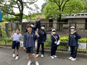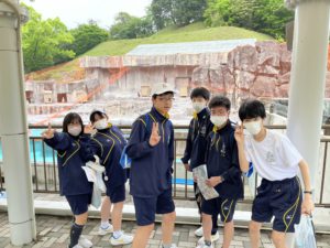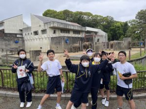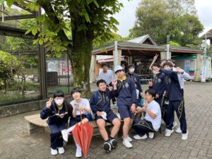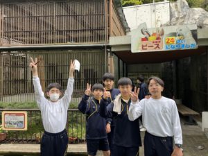 とべ動物園に到着してすぐ、ふれあいセンター2階に集合し、学年部長から注意事項を聞いたあと、クイズラリーが始まりました。クイズラリーは班での活動でしたが、皆で協力して動物園中を周り、動物に関する問題の答えを探し回っていました。話したことのなかった友人と仲良くなれたとの声も聞こえてきました。
