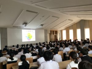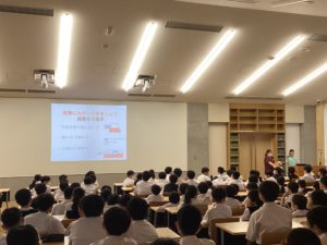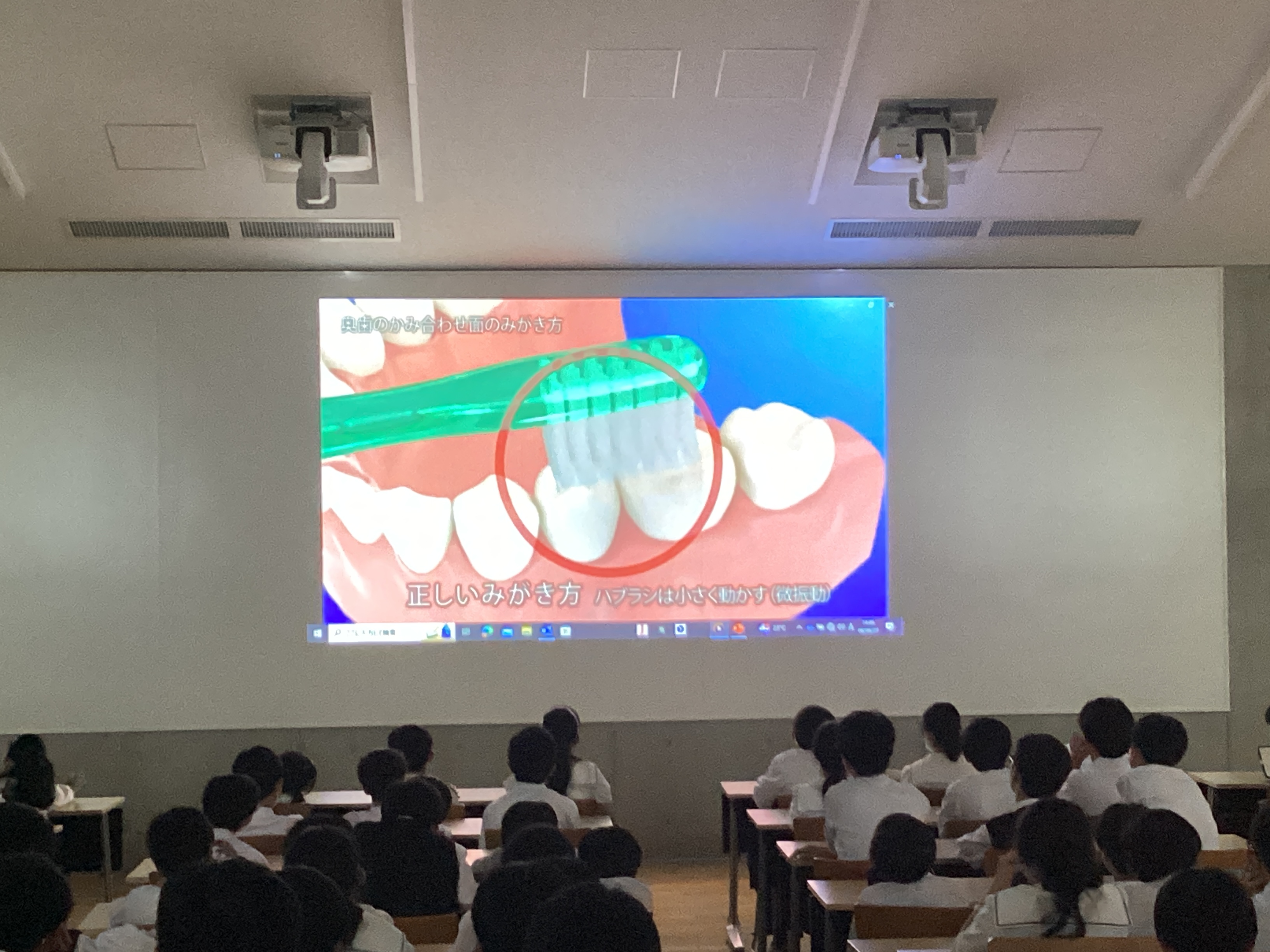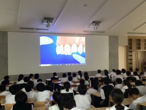 6限のLHRにて、歯科衛生士2名をお招きし、中1生に歯磨き指導をしていただきました。