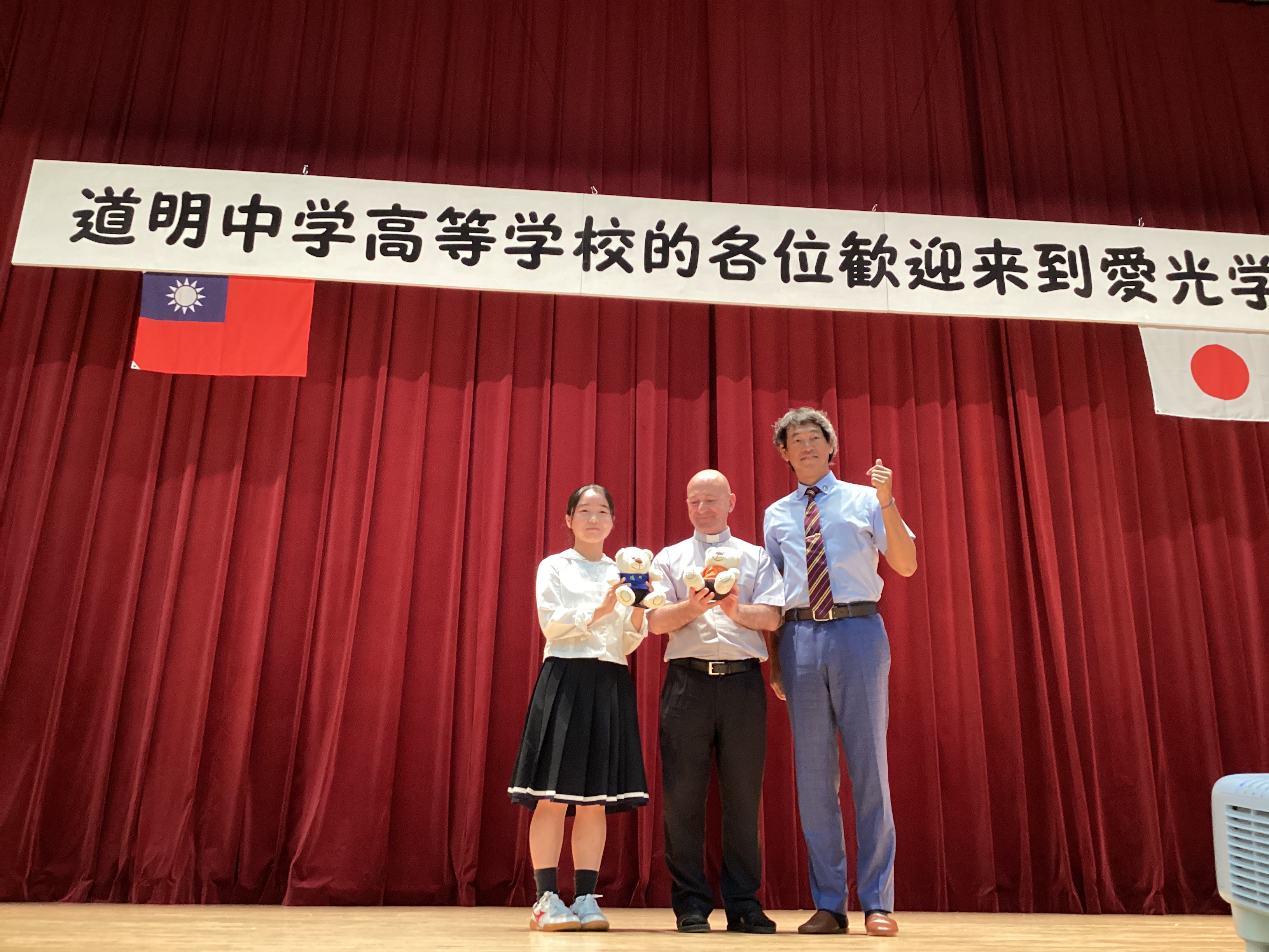 最後に、来校を記念して愛光学園からは愛光グッズのプレゼント紹介と、道明中学・高等学校より記念品を頂戴しました。