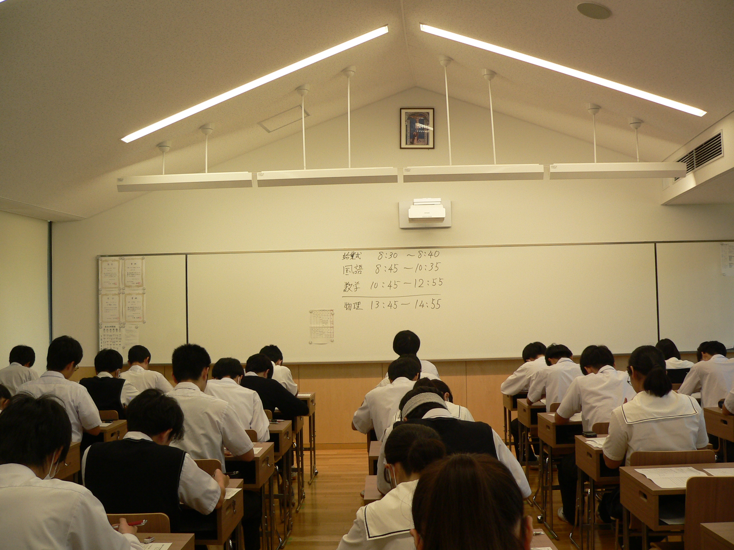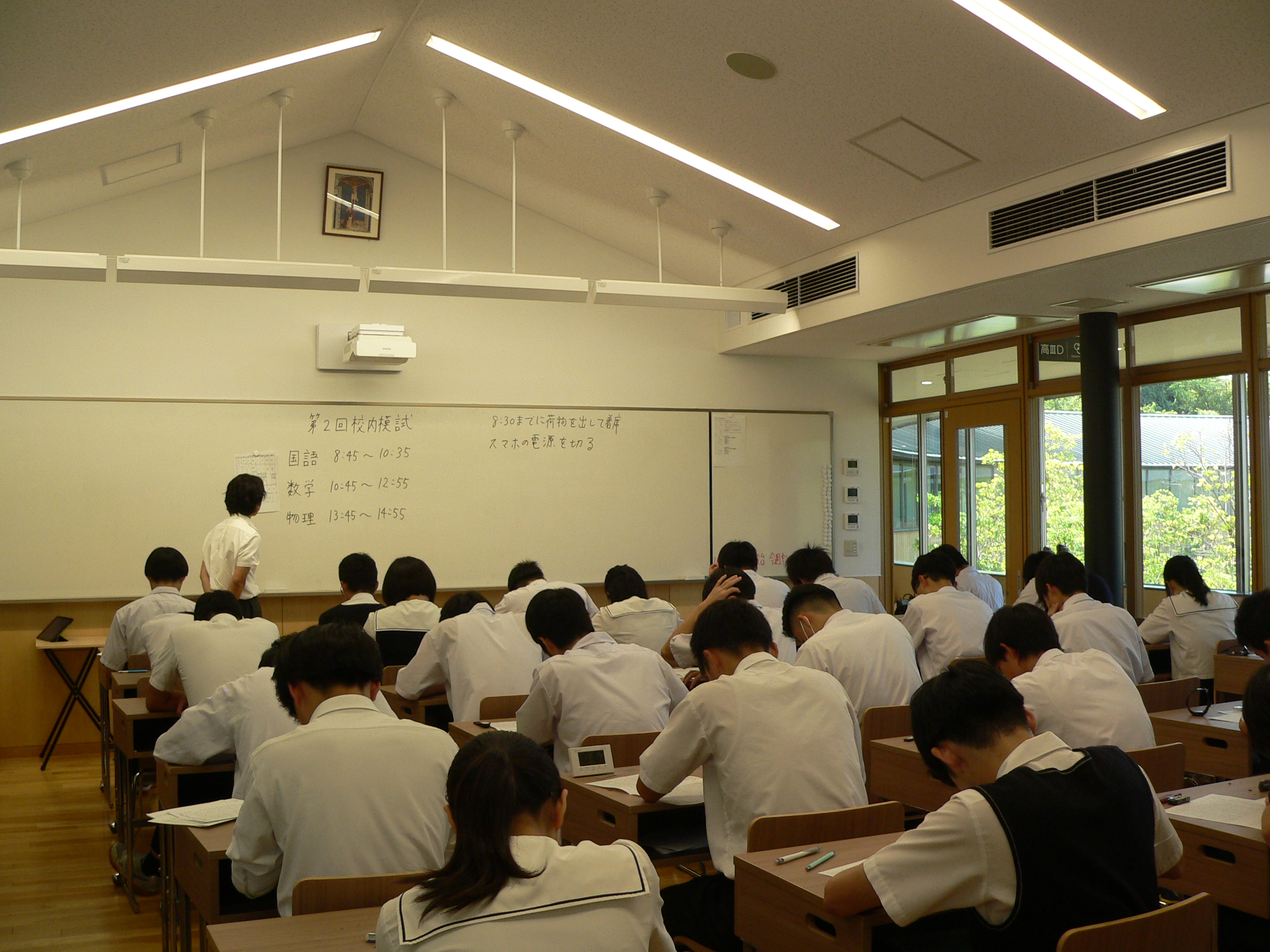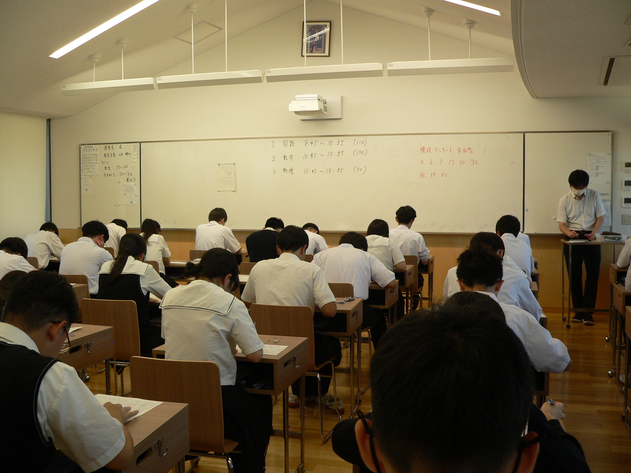 今日は放送による始業式後、中1~高Ⅱは実力考査、