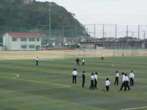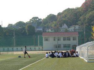 昼休みのグラウンドでサッカーをする生徒たちです。