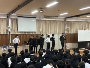 オープニングでは、数人の希望する生徒が前に出て、前で話すというのはどんな気持ちなんだろうということを体験しました。それぞれによって感じ方が違うということや、意外と緊張しないなど新たな「観方」を感じることができました。