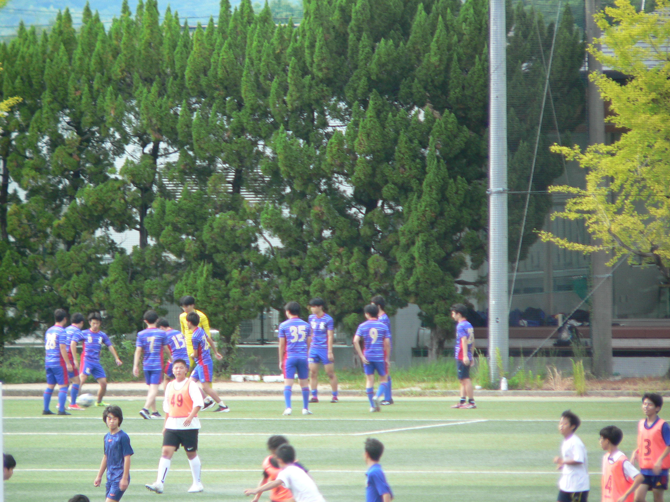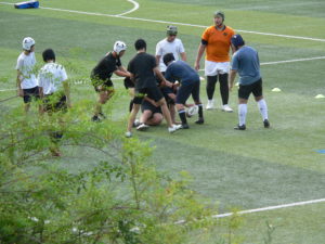 人工芝のグラウンドで練習をするラグビー部員です。