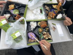 赤門前です。 昼食のお弁当です。 雨も降らず、とても過ごしやすいお天気でよかったです。