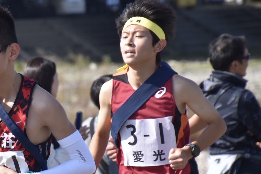 「愛光学園がこの位置です!愛光学園は久しぶりの出場なんです!2003年以来、22年ぶりの出場です。松山市中学総体で敗れたサッカー部員が敗れた試合の翌日に、サッカー部の顧問で現駅伝監督でもある先生が、朝に生徒が懸命に走って練習をしている姿を見て「愛媛中学駅伝というのがあるよ。出てみない?」と生徒に声を掛けたというところから、この愛光学園の出場が決まったそうです。ラグビー部やバスケ部にも声を掛けたそうです。過去には第1回大会から第6回大会まで愛光学園は連続出場しておりまして、そのあと第9回、10回、19回、21回、23回、そして22年ぶりの今大会の出場ということになりました。この愛光学園も素晴らしい位置で襷をリレーしていますので、走力のある選手を揃えてきているのかもしれません!」