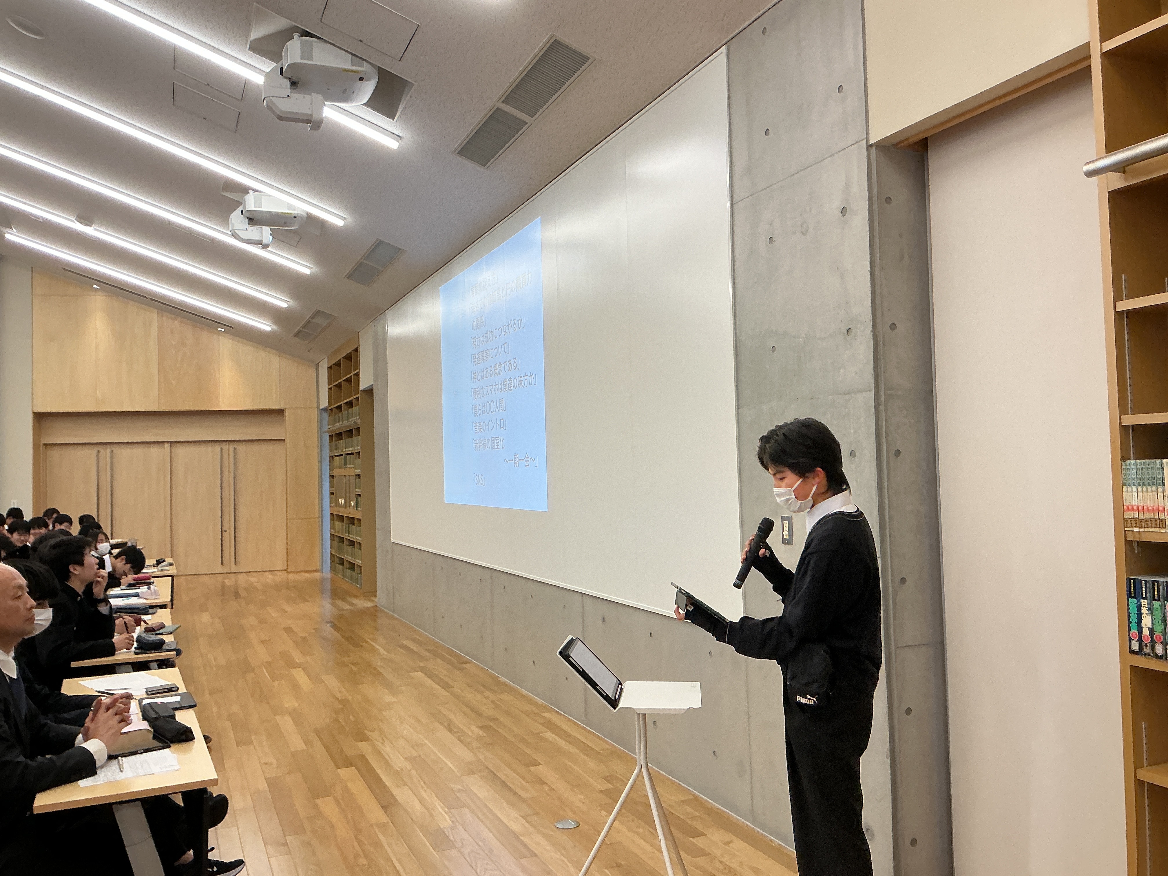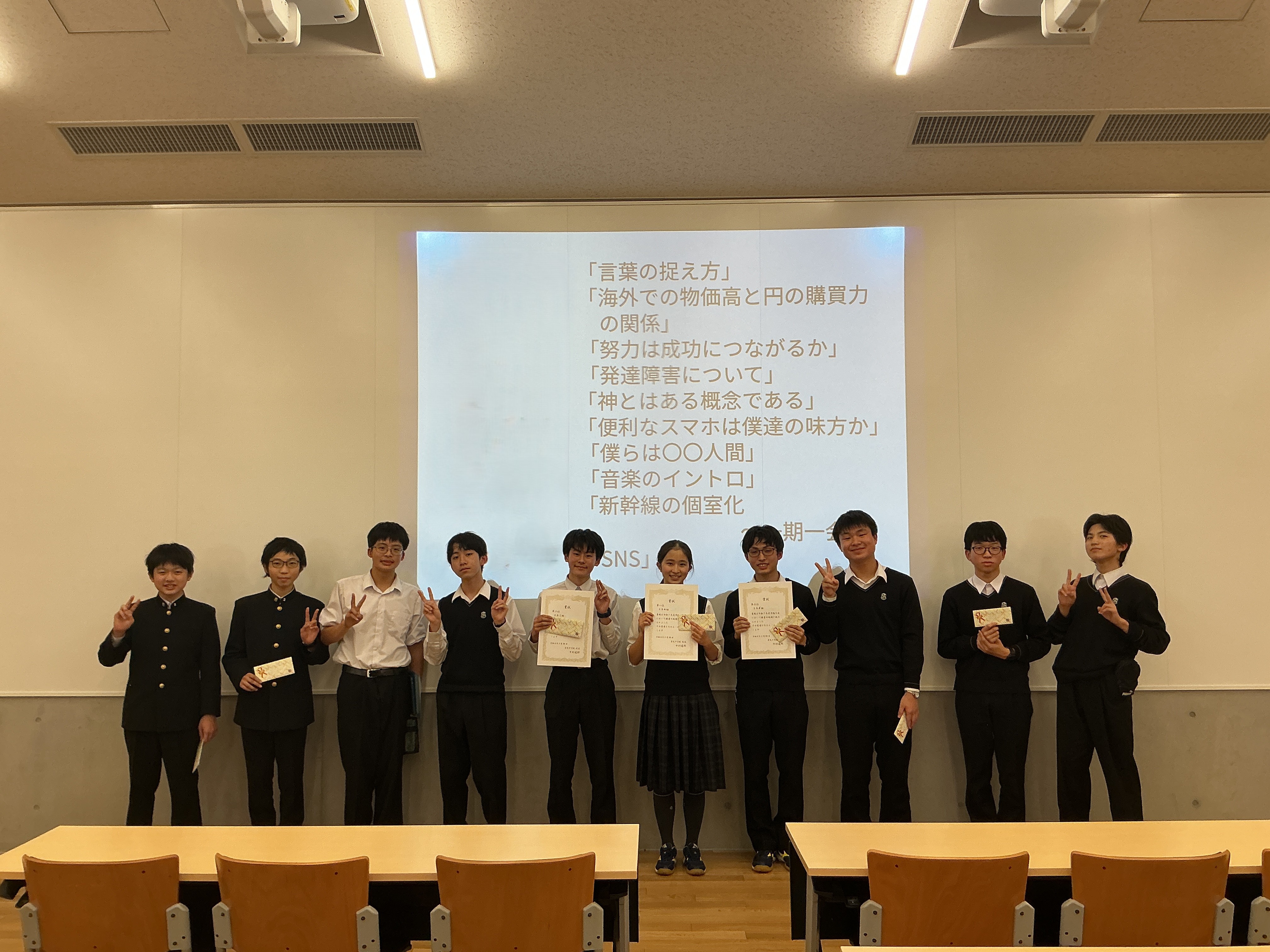 クラス内での予選、決勝を経て、生徒たちの中から選出された10名の生徒が、自分の問題意識に合うテーマを選び、ニュース記事や実際のデータに基づきながら、自分の考えを述べました。