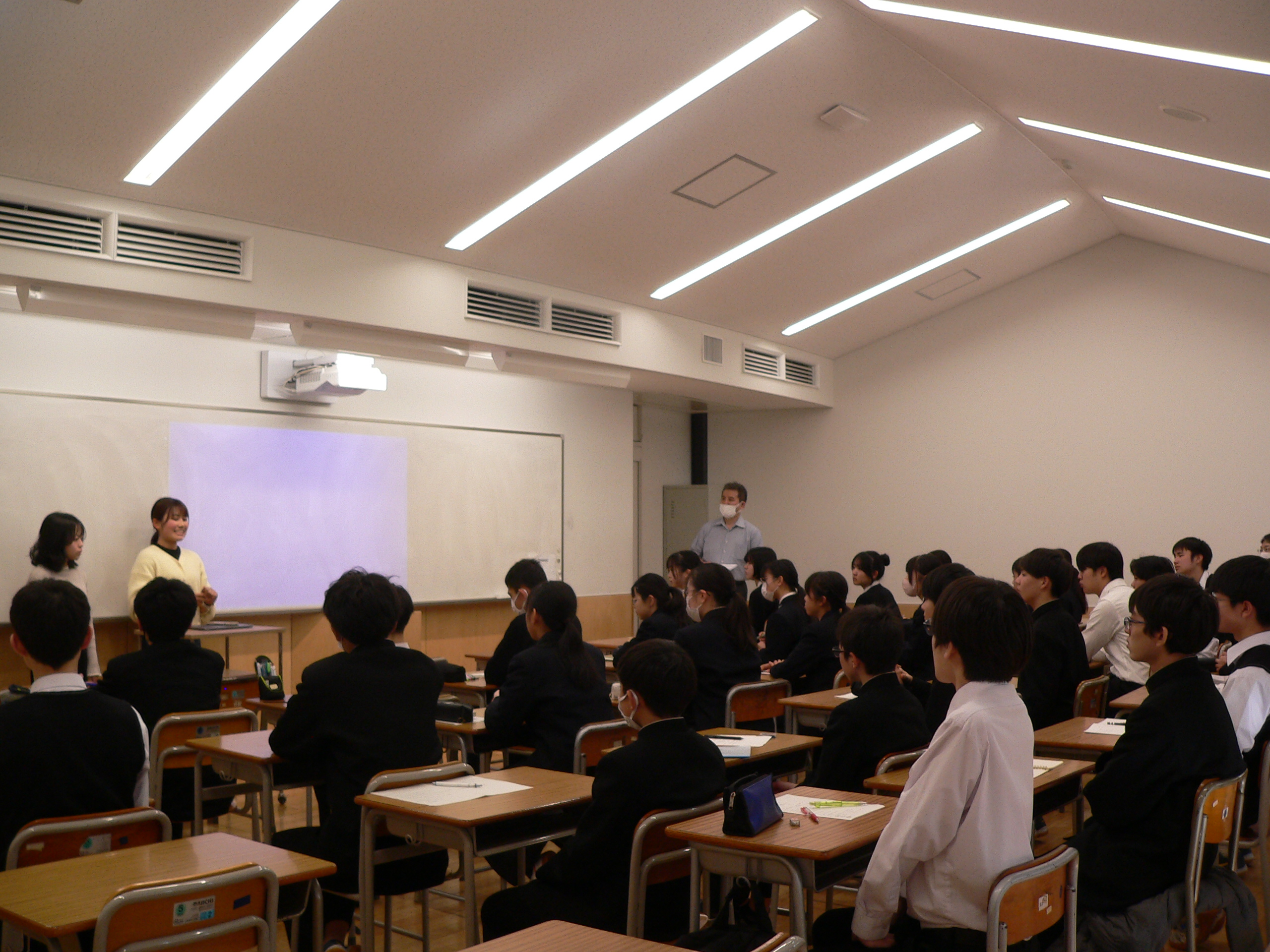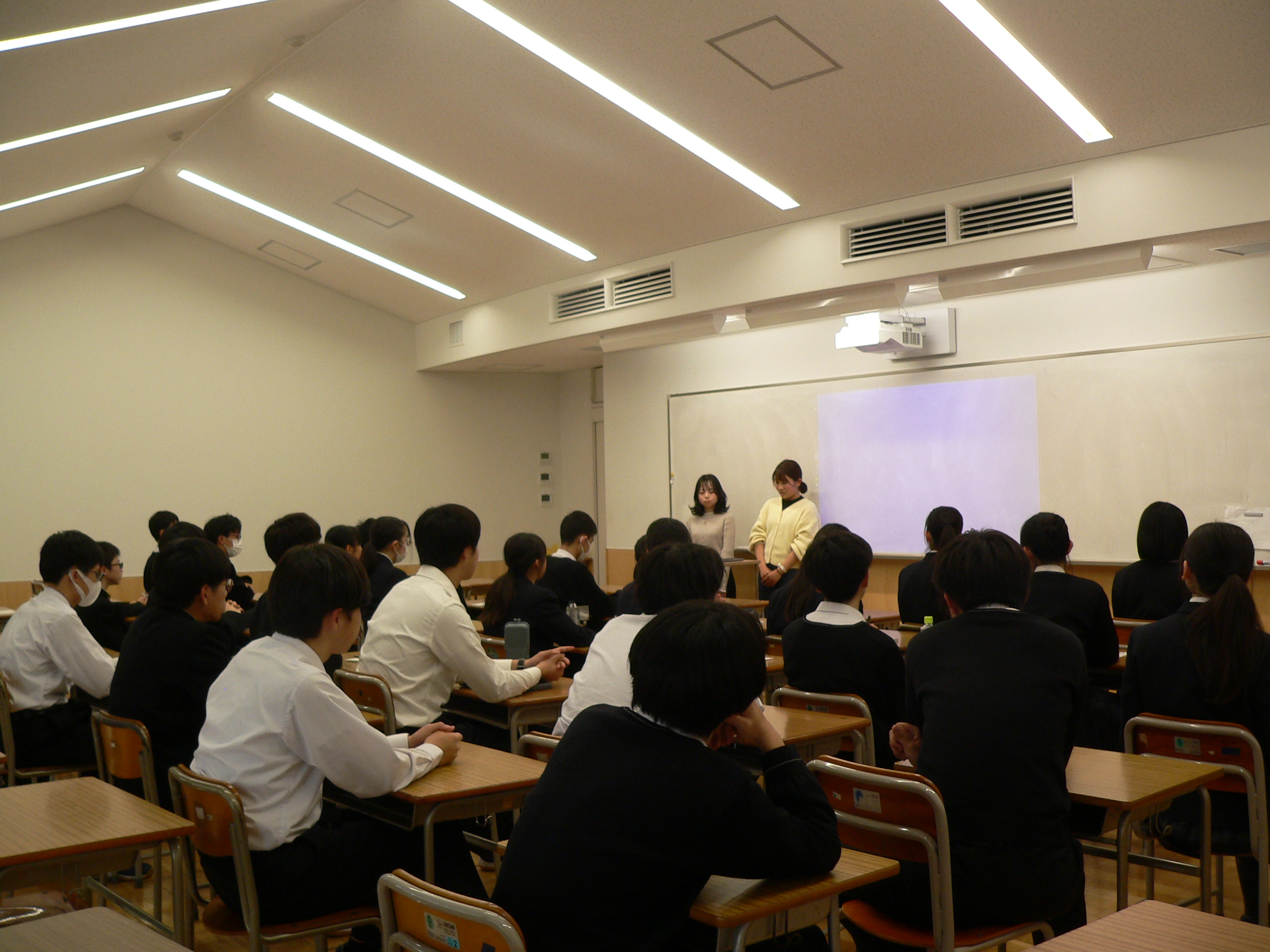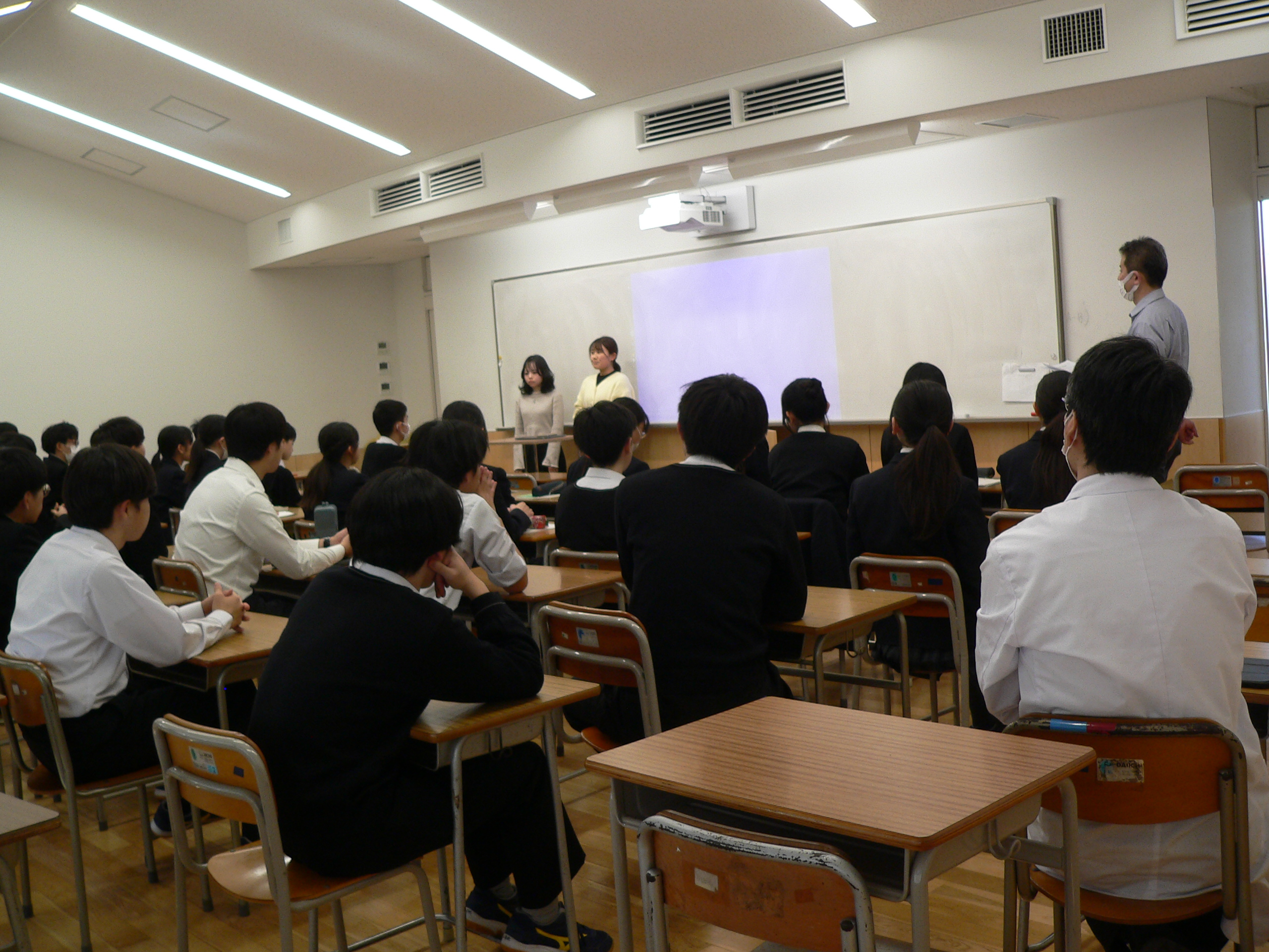 東京大学経済学部3年生の田中莉紗子さんと東京大学3年生の近藤芳香さんをお招きして講演会・座談会を開催しました。対象は全学年の希望生徒です。