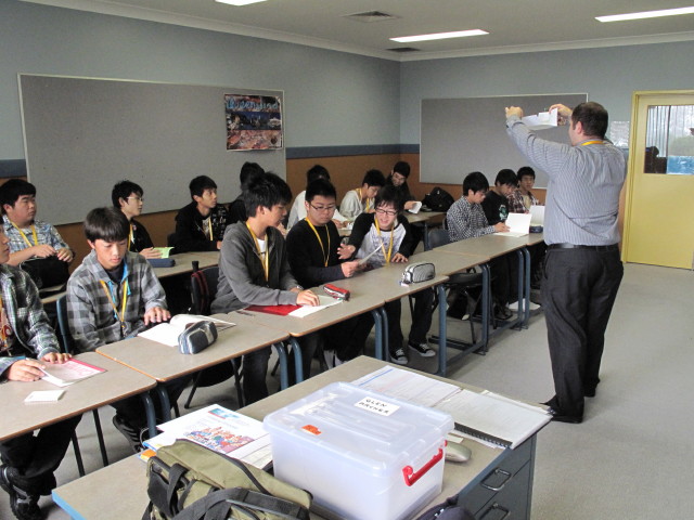 今日から午前中は授業開始です。愛光生のクラス担当のMr.Glen先生です。もちろん学校内は英語のみ。しかし,とても分りやすく丁寧に話をしてくれたそうです。
