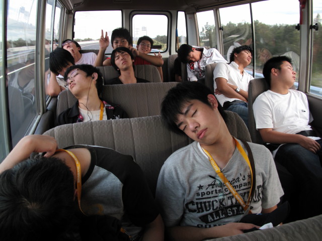 帰りのバスの中の様子。みんな気絶しています。ウソです。楽し過ぎてお疲れの様子です。