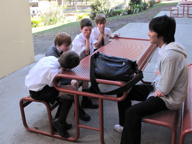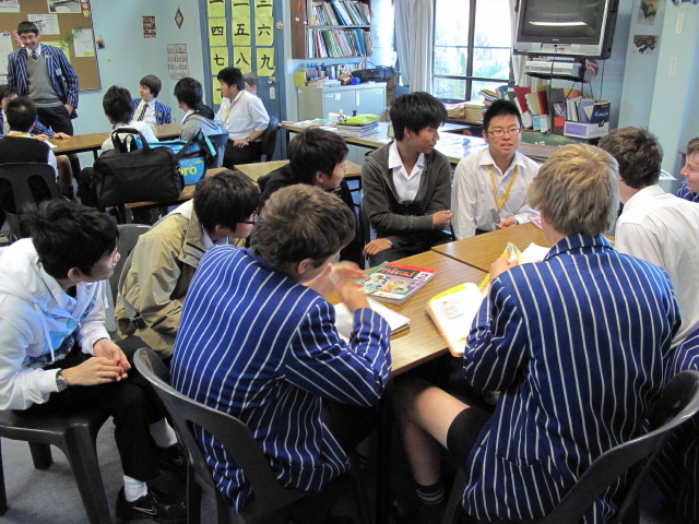 その後は少人数に分かれて,本校の生徒が日本語の先生になって,英語で日本語を(?!)教えていました。その後は一緒に鬼ごっこをして遊びました。