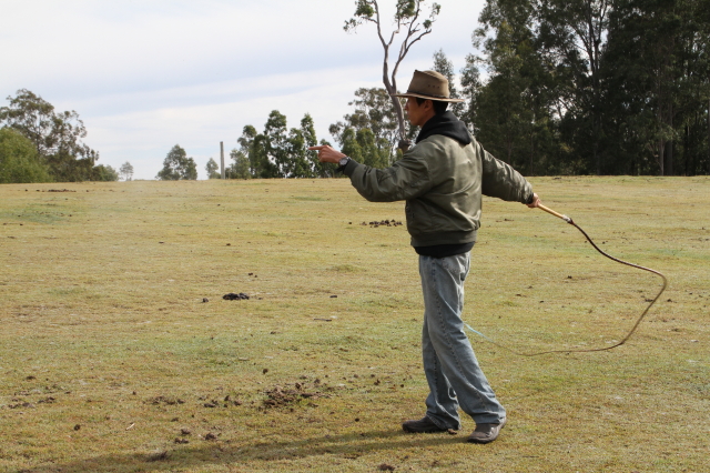 午前中,まずはオーストラリアの牧場ではおなじみの「鞭鳴らし」です。これは牛などを追う時の手段のひとつです。鞭を上手にしならせて地面をたたくと「パチン!」と凄い音が轟きます。まずはインストラクターの方が簡単そうに手本を見せてくれますが,我々にはなかなか思うように音が出せません。