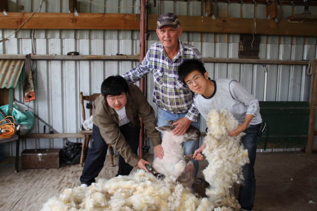 ランチの後,午後は羊の毛刈り体験をしました。ベテランの羊の毛刈り職人直々の指導です。これも全員が体験をして,最後に記念の写真撮影をしました。刈った羊の毛は,お土産に少しずつ分けてもらいました。