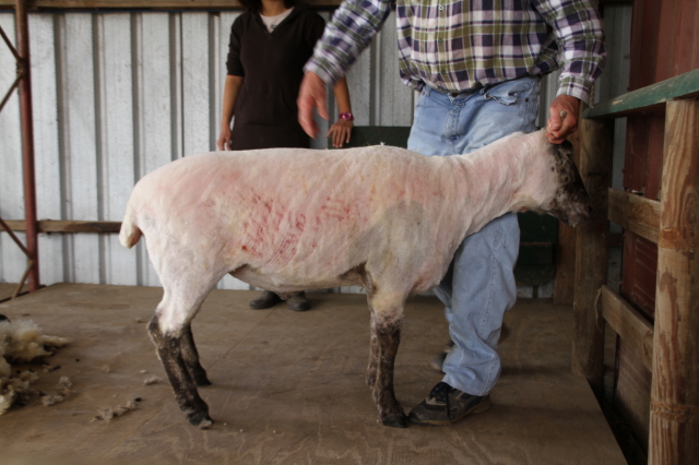 毛を刈られた羊です。目がとても悲しそうでした。オーストラリアは今が冬。風邪をひきませんように・・・。
