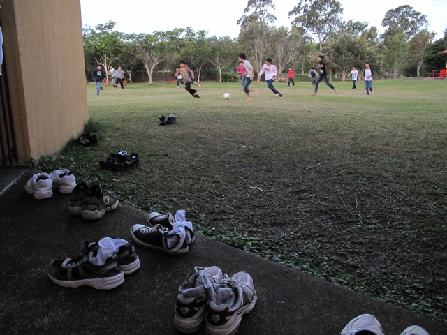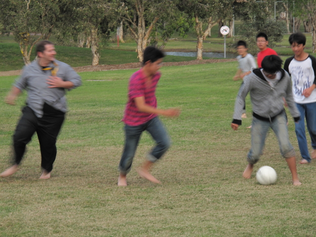 映画の後は,中庭の芝生でサッカーを楽しみました。オーストラリア,特にナッジの芝生は極上の芝生です。Mr.Glen先生に「芝の上では裸足になって遊ぶのがオージー流だ!」と教えられ,全員,ご覧の通りです。