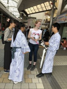 浴衣でのおもてなしは,明治の雰囲気を醸し出すためです。自分たち手作りの看板でこのツアーを紹介中!