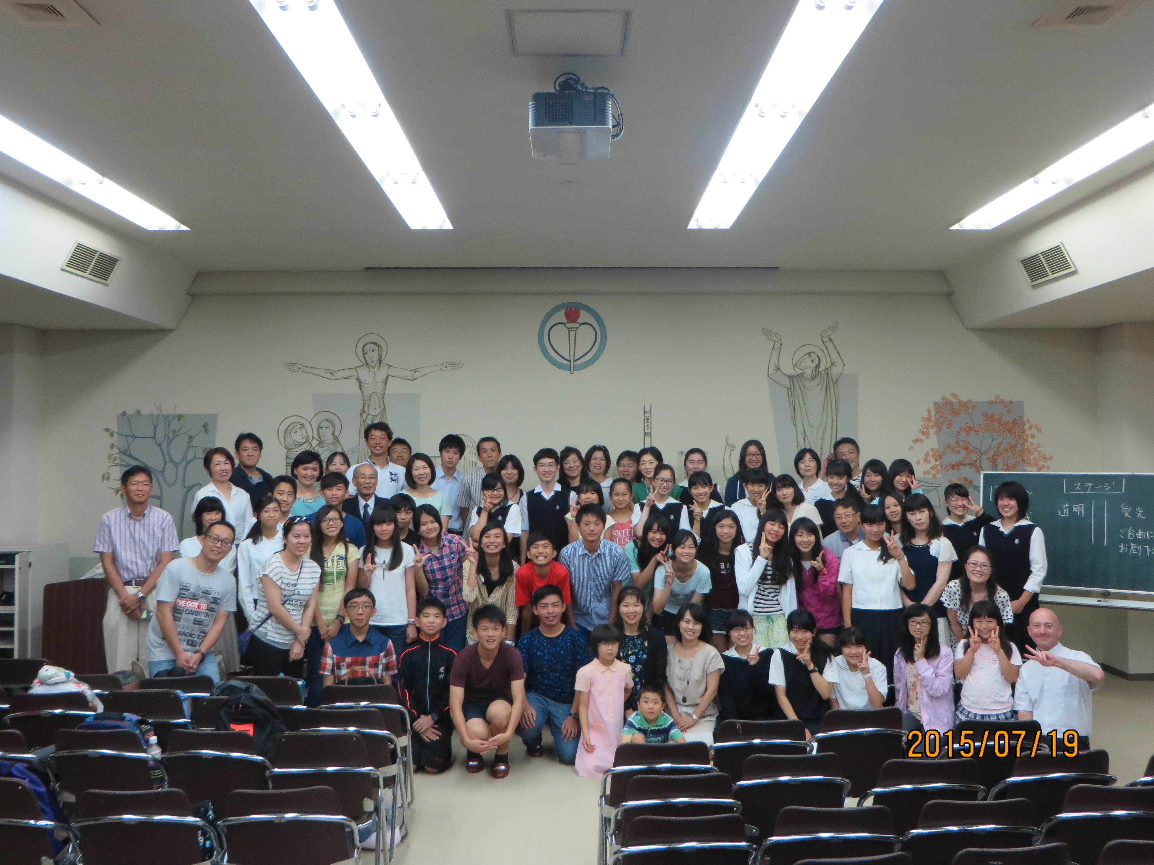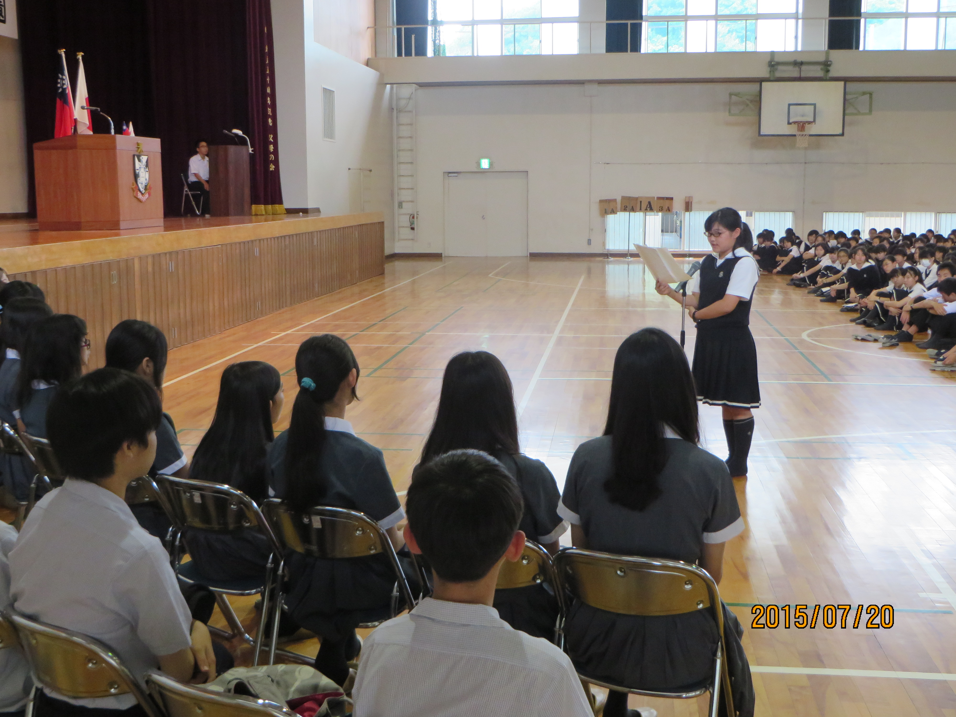 夏期前期補習の初日に歓迎式を催しました。14名の女子生徒と7名の男子生徒。引率の2名の先生に加えて父母の会会長と副会長。校長夫人に管理職。そして校長先生を迎えました。