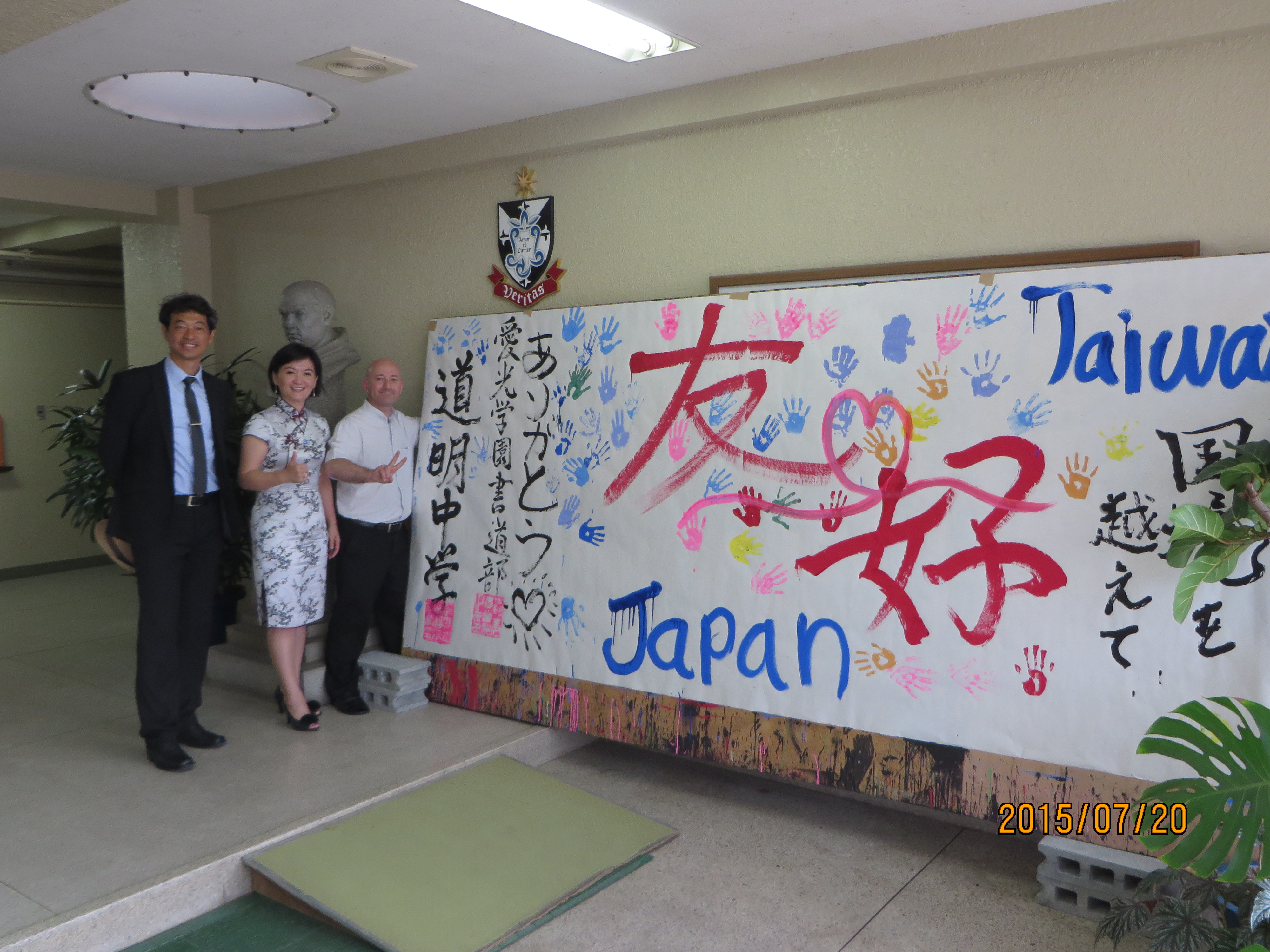 書道部員による手厚い歓迎がうかがえる文字”友好”が見えます。書道部員の心を込めたパフォーマンスが、道明生を熱くさせました。全員で記念撮影!
